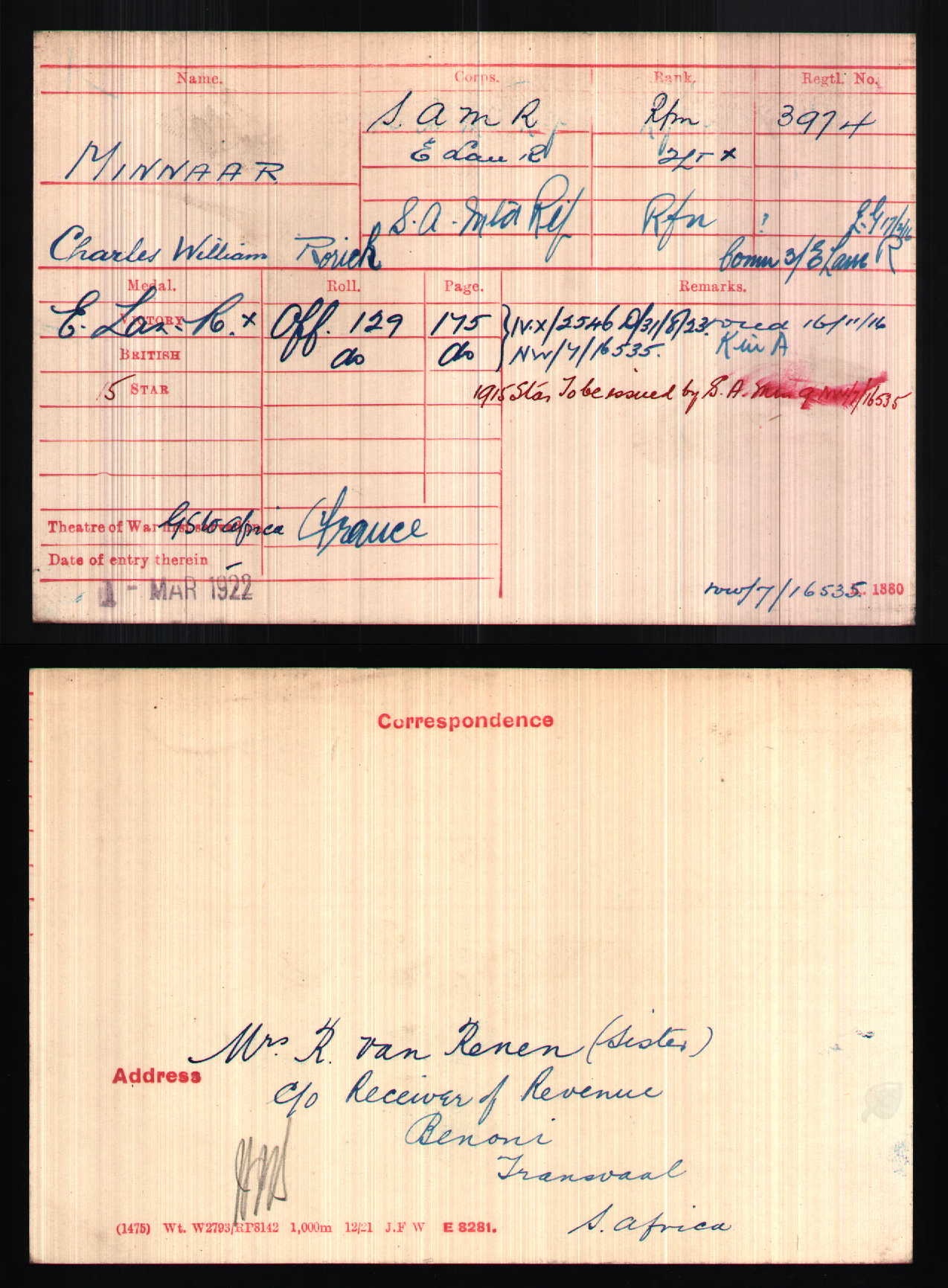 Son of Stephanus Isaac Minnaar and Mrs. M. Minnaar, of Cape Province. Born August 1882 in Wepener, Orange Free State, South Africa. |