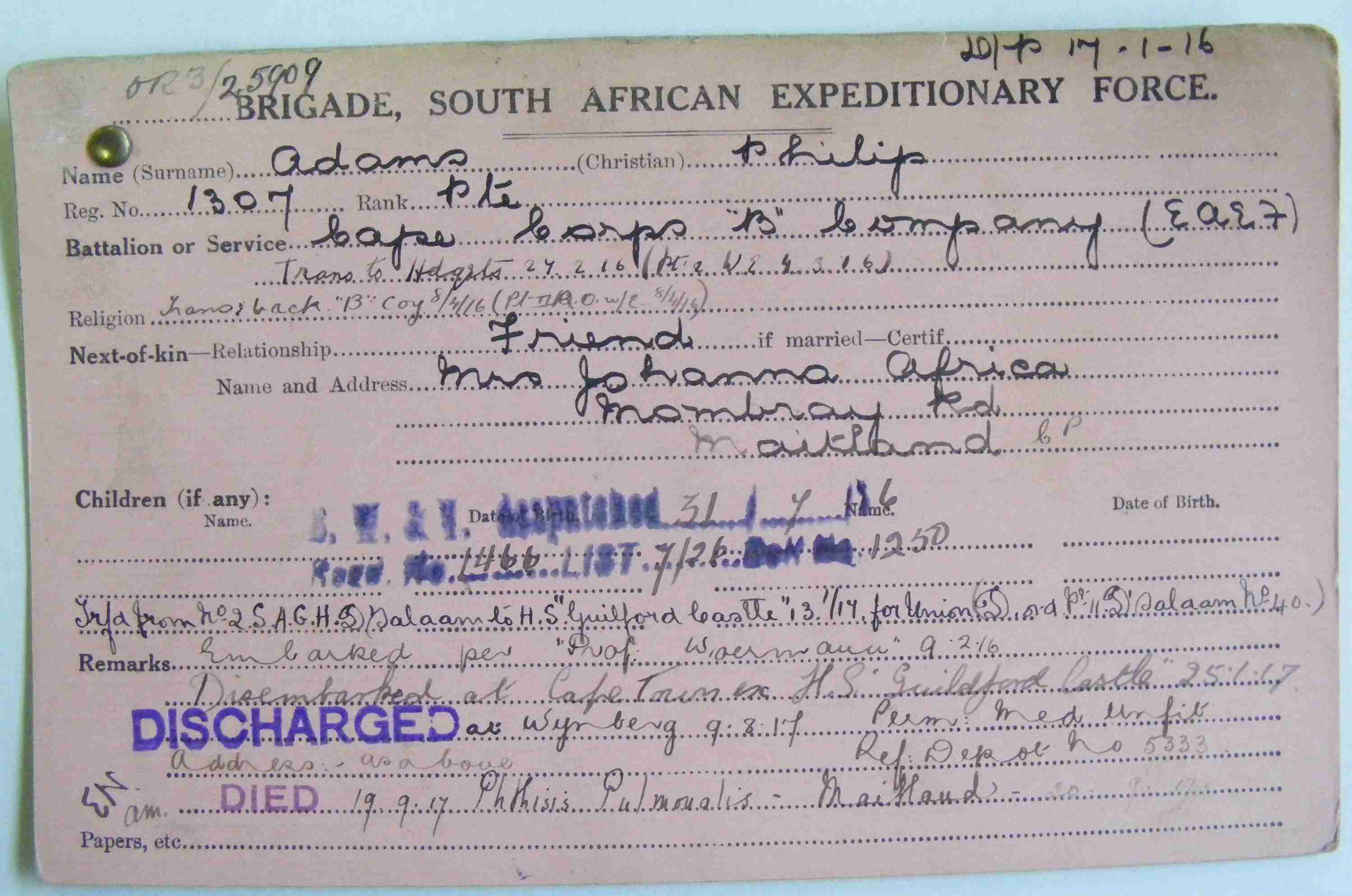 Friend of Johanna Africa, of Mowbray Road, Maitland, Cape Province. Released medically unfit 9 August 1917