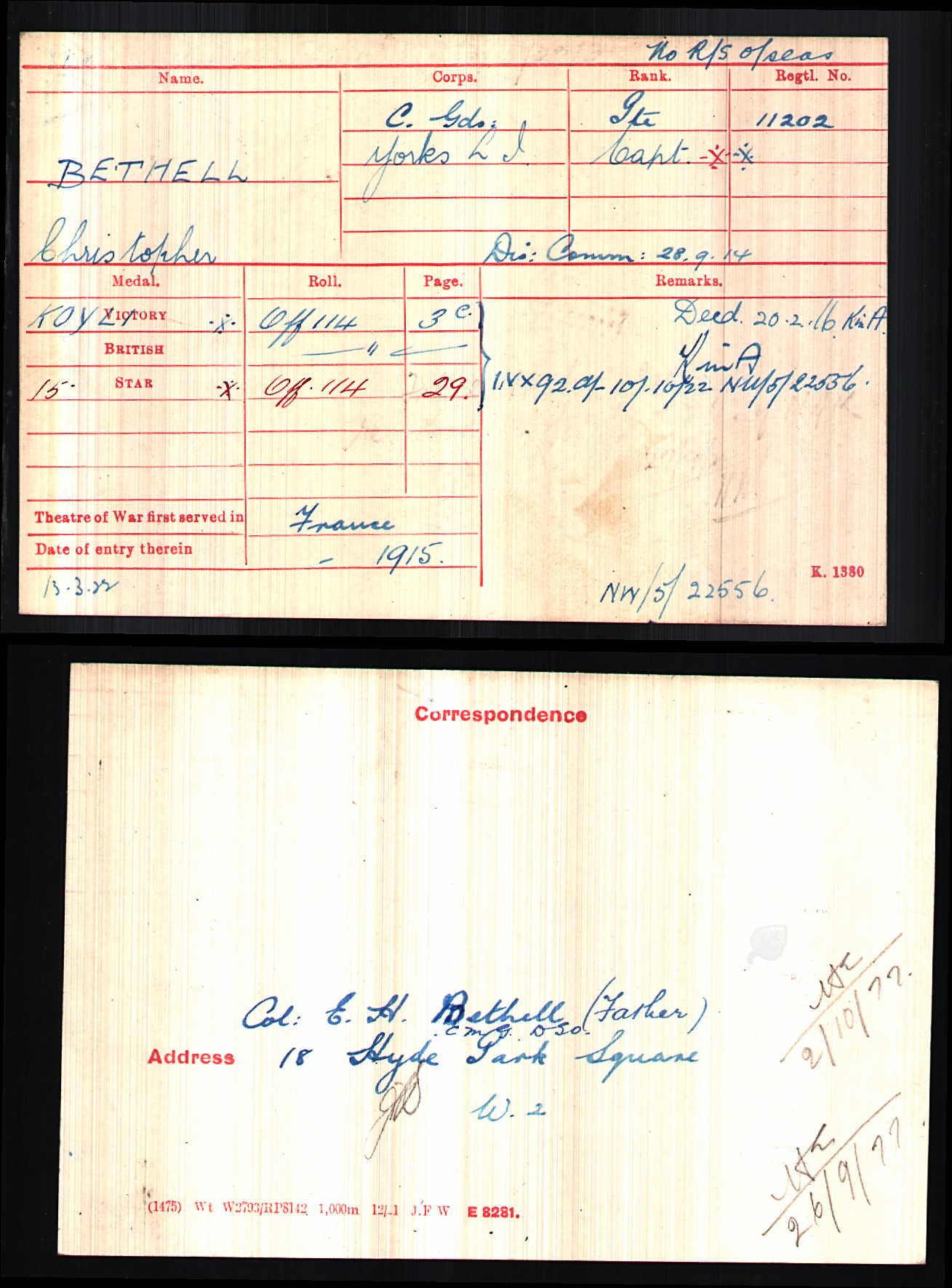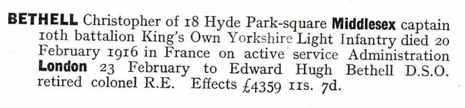 Son of Col. Edward Hugh and Gertrude Bethell, of 18, Hyde Park Square, London, W.2. Born Poonah, India. Educated at St. Andrew's College, Grahamstown. Barrister-at-Law of the Inner Temple. ref. South African Roll of Honour 1914-1918.