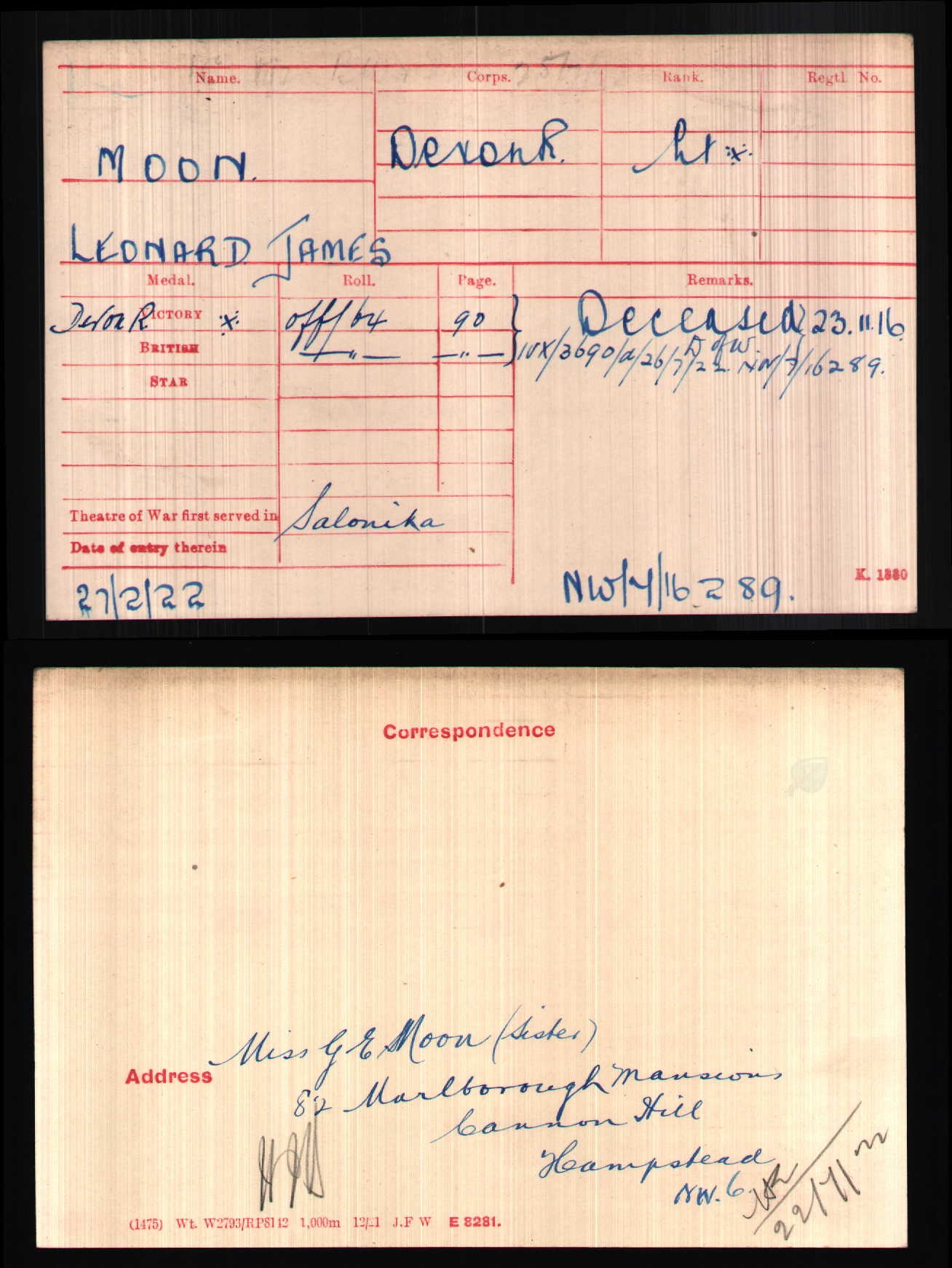 Son of William and Sarah Moon. Brother of Miss G. E. Moon, of Cannon Hill, Hampstead. School Master From Wellsley House School in Kent. He was in the Westminster XI in 1894 and two following seasons, heading the averages with 25.71 in 1895 and being second in 1896 with 46.69. In the last-mentioned year he played an innings of 57 against Charterhouse. Proceeding to Cambridge, he obtained his blue and both in 1899 and 1900 played against Oxford. In the former year, when he scored 138 v. the Australians, he was second in the averages with 28.07, and in the latter fifth with 27.09. In his two matches against Oxford he made 154 runs in four innings, and in 1900 (when his scores were 58 and 60) scored 101 for the first wicket in the second innings with J. Stanning (60). In 1898 he had become a member of the M.C.C. and in the following season began to play for Middlesex. Against Gloucestershire at Lord's in 1903 he and P. F. Warner made 248 together for the first wicket, and five years later the same pair scored 212 for the opening partnership v. Sussex on the same ground. In the autumn of 1905 he was second in the averages for the M.C.C.'s team in America with 33.00, and before the next season opened toured South Africa with another M.C.C. side. During the latter tour he made 826 runs with an average of 27.33. He was a vigorous batsman who could cut well, and a useful wicket-keeper. At association football he gained high honours, obtaining his blue for Cambridge and playing for the Corinthians. Remembered on LORDS CRICKET GROUND MCC MEMBERS WORLD WAR 1 MEMORIAL. ref. South African Roll of Honour 1914-1918 |