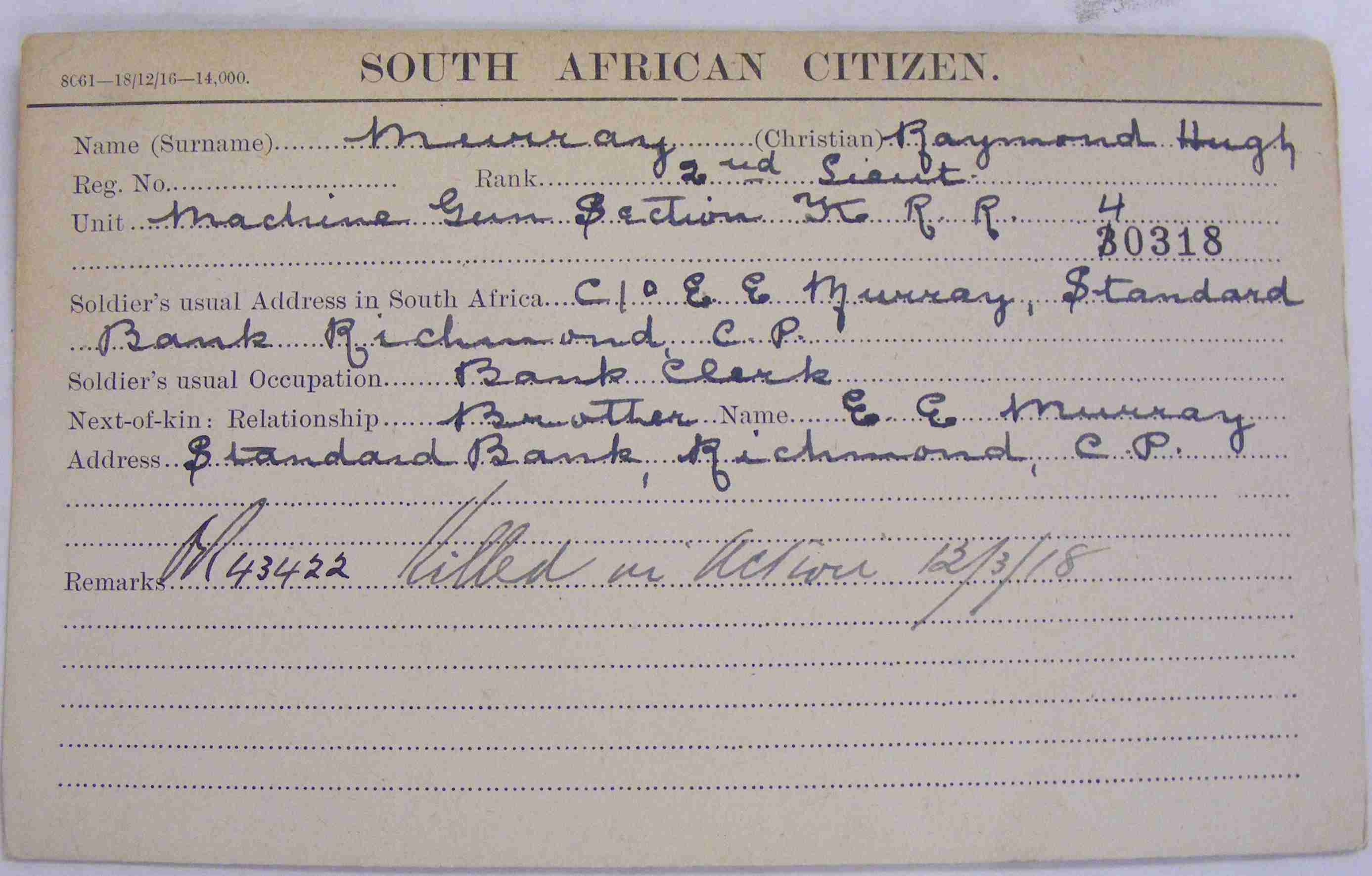 Son of George B. and Elizabeth Murray, of Colesberg, Cape Province. enlisted Sept., 1914.