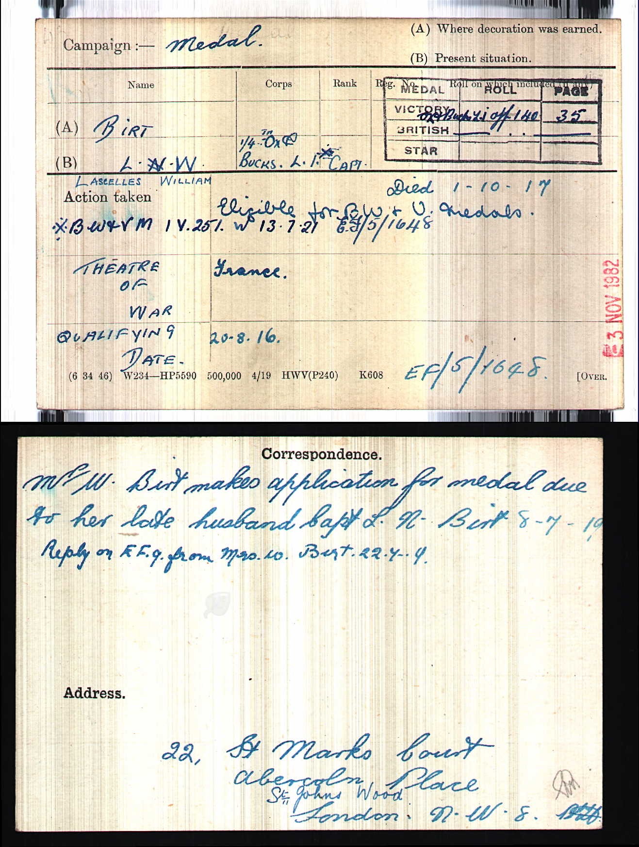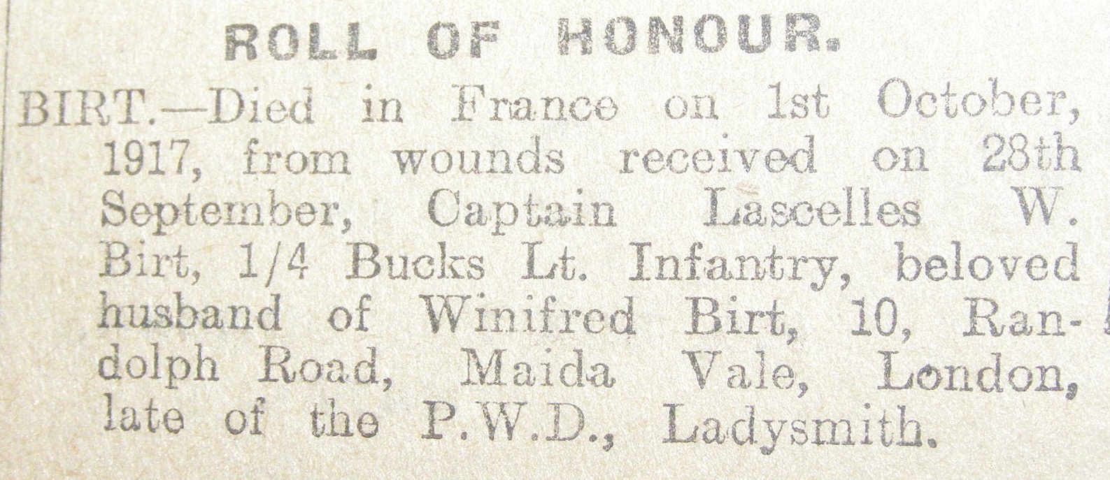 Son of the late Raymond John and Constance Hogarth Birt; husband of Winifred Birt, of 22, St. Mark's Court, Abercorn Place, St. John's Wood, London. Served in Thornycroft's Mounted Infantry in the South African Campaign. Mentioned in Despatches. ref. South African Roll of Honour 1914-1918