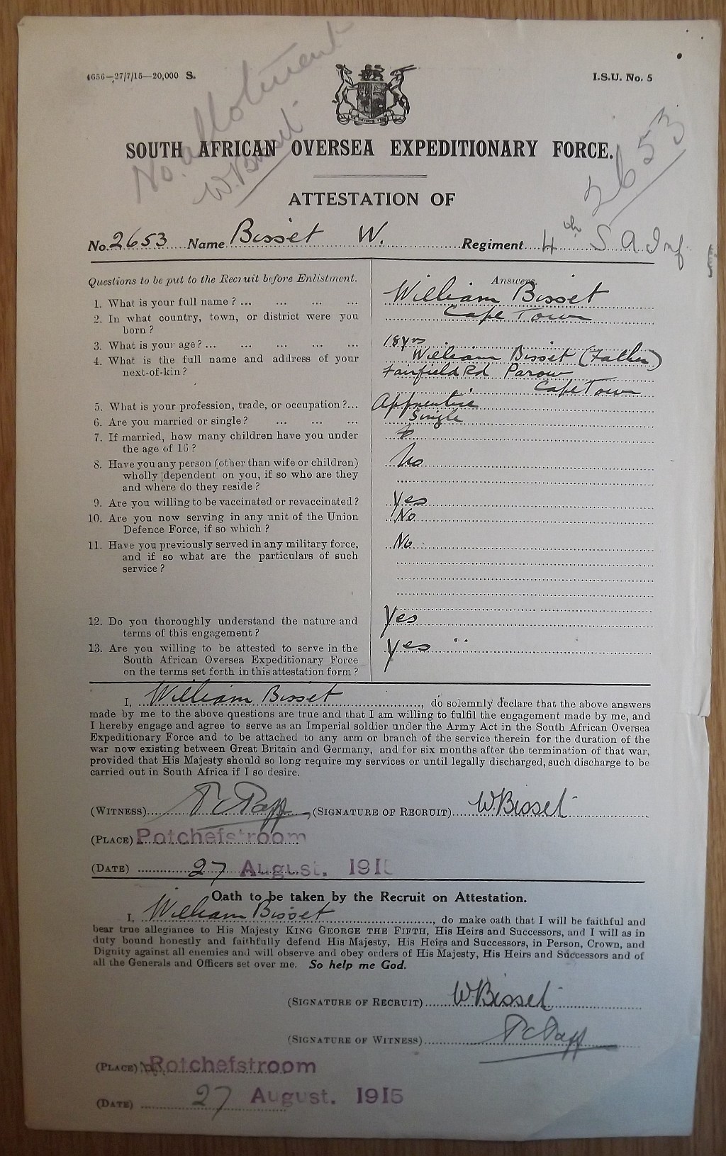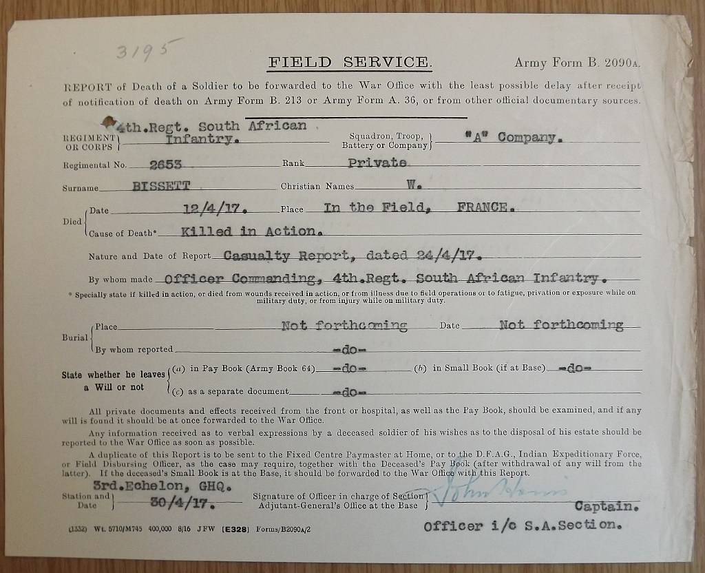 Son of William and Jessie Bisset, of Picton St., Parow, Cape Province. Born Observatory. An apprentice Salt River Works. Commemoration stone in Cape Town (Maitland) Cemetery |