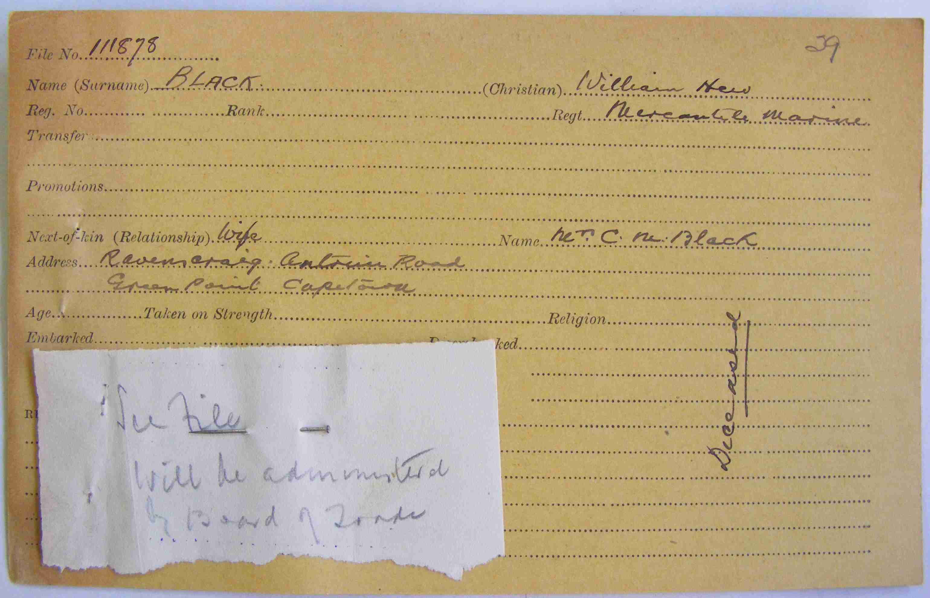Husband of Christina Black (nee MacFarlane) of "Brandon," 20, Morris Rd., Polygon, Southampton (formerly of Ravenscraig Antrim Road, Green Point, Cape Town). Born at Kilmarnock.