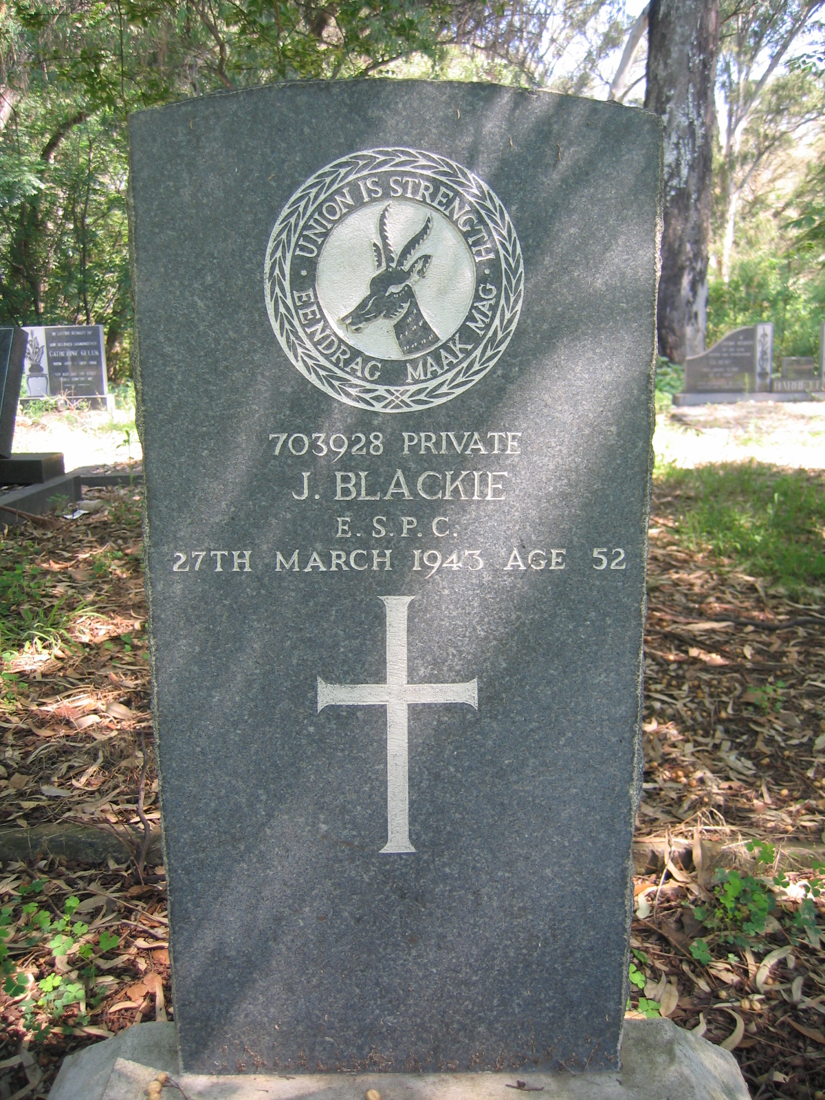 Son of Willem Petrus Blackie and Johanna Maria Blackie, of Van Wyk's Street, Warrenton, Cape Province. Husband of Engela Blackie. He had 2 sons and a daughter. |