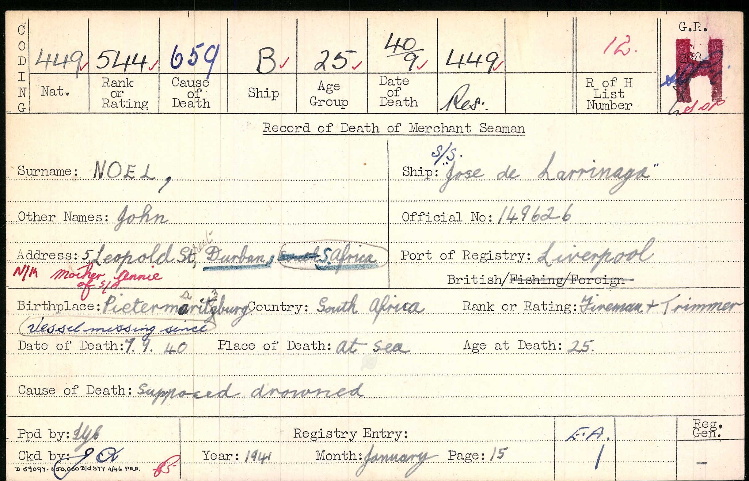 Son of Annie Noel, of 5 Leopold Street, Durban. Born Pietermaritzburg. Coloured man. ref. South African Roll of Honour 1939-45 |