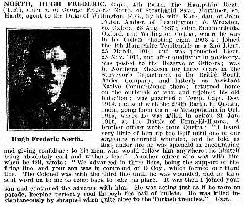 Son of George Frederic and Kate North, of Stratfield Saye, Hants. Educated at Summerfields, Oxford and Wellington College. Assistant Native Commissioner in Northern Rhodesia with the British South Africa Company.