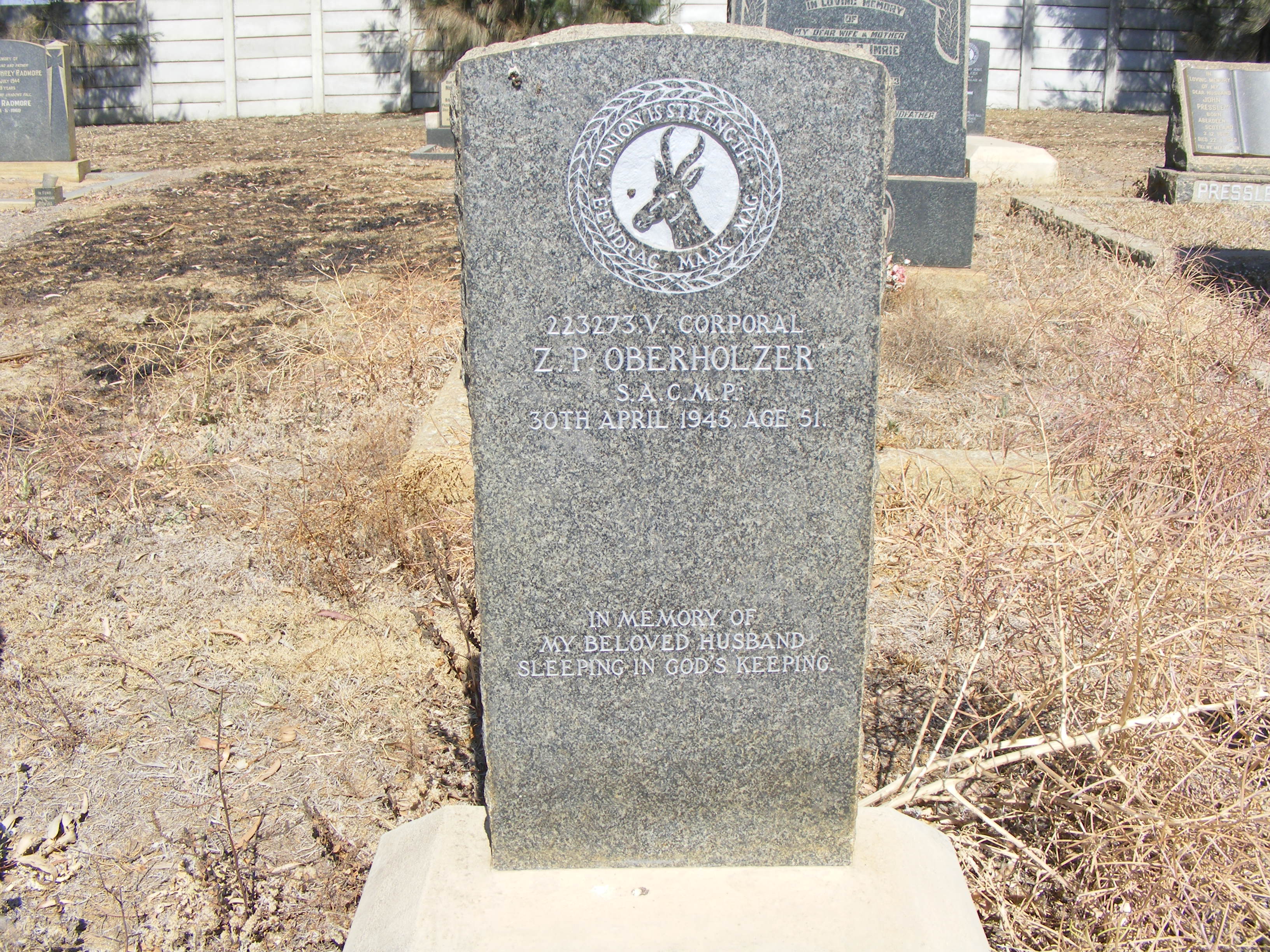 Son of Zacharias Petrus and Johanna Catharina Oberholzer; husband of Susanna Christina (nee Bezuidenhout) Oberholzer, of Benoni.