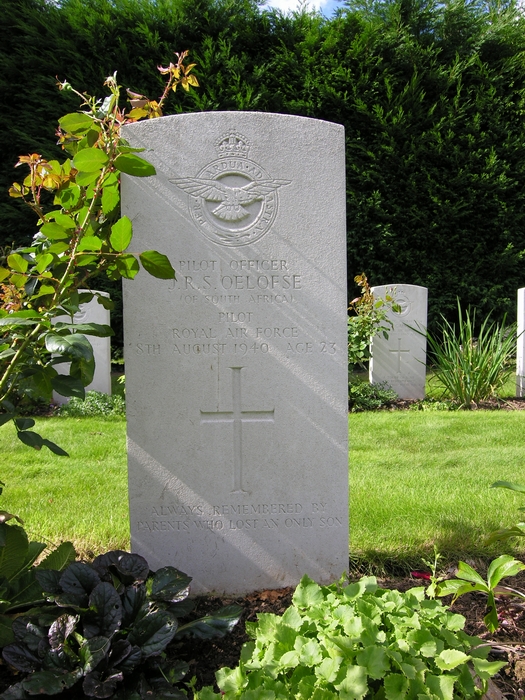 Son of Johannes Roeloph and of Hester Sarah Oelofse (nee Brummer), of Johannesburg, Transvaal, South Africa. Born Johannesburg. Educated at Potchefstroom Boys' High School in 1934, having begun his education there as a boarder in 1930. Joined the RAF on a short service commission in June 1939. After completing his training, he began a course at 11 Group Pool, St. Athan on February 1st 1940. He was posted away two days later to make room for twelve Finnish pilots due to arrive for Hurricane training. One of twenty-three South African pilots who served during the battle of Britain, nine of whom were killed. "One of the few" Battle of Britain pilot. |