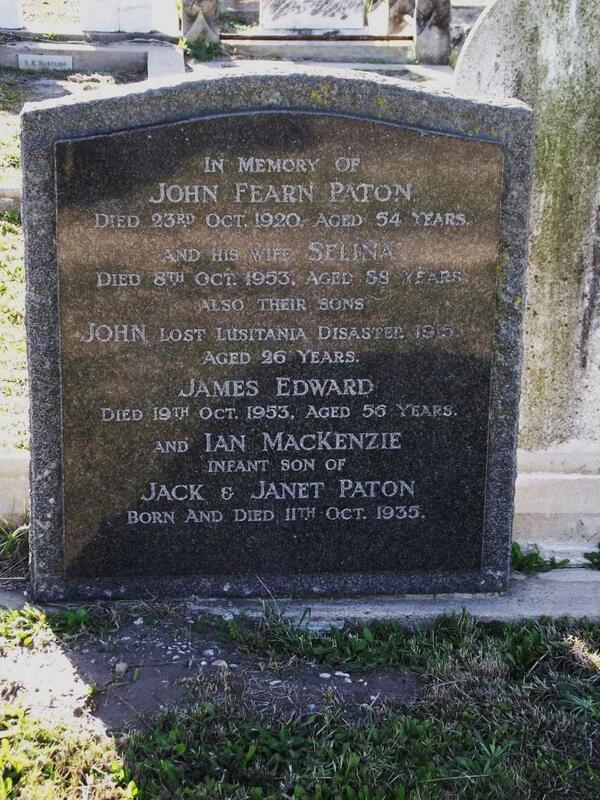 Son of John Fearn and Selina Paton. Born Buenos Aires, Argentina. Commemoration stone in Port Elizabeth (South End) Cemetery, Eastern Cape |