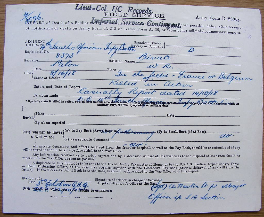 Son of Edwardina Paton, of St. James Buildings, Small Street, Johannesburg. On Bezuidenhout Valley War Memorial