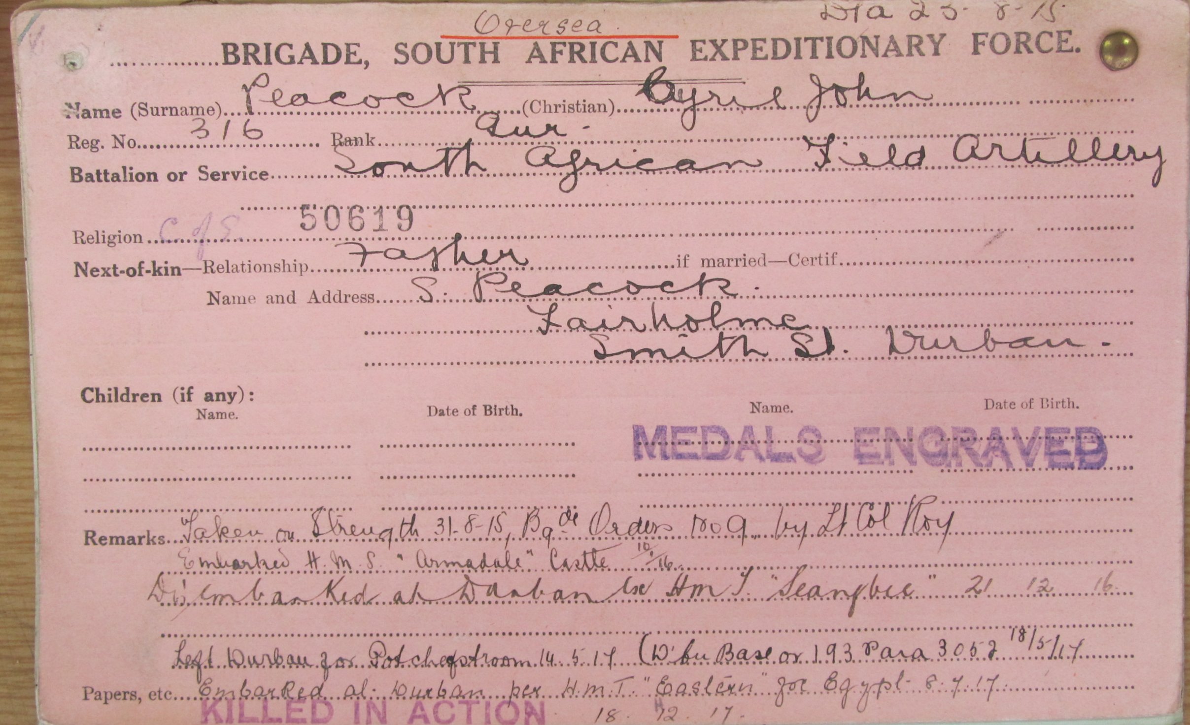 Son of Samuel and Mildred Elizabeth Peacock, of Fairholme, Smith Street, Durban |