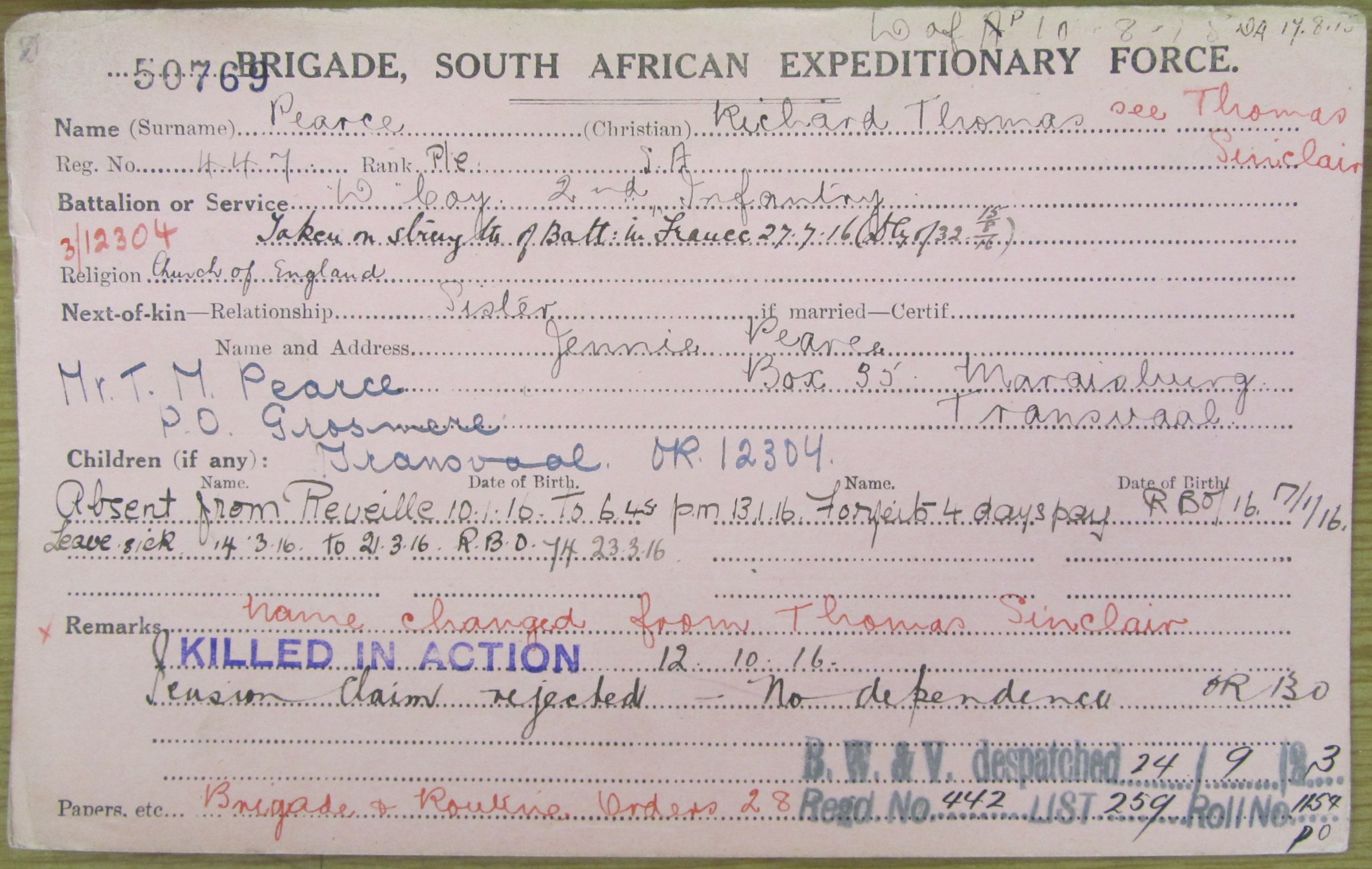 Son of Thomas Martin Pearce, of P.O. Grosmere, Transvaal. Born at St. Ives, Cornwall, England. (Served as Thomas SINCLAIR). |