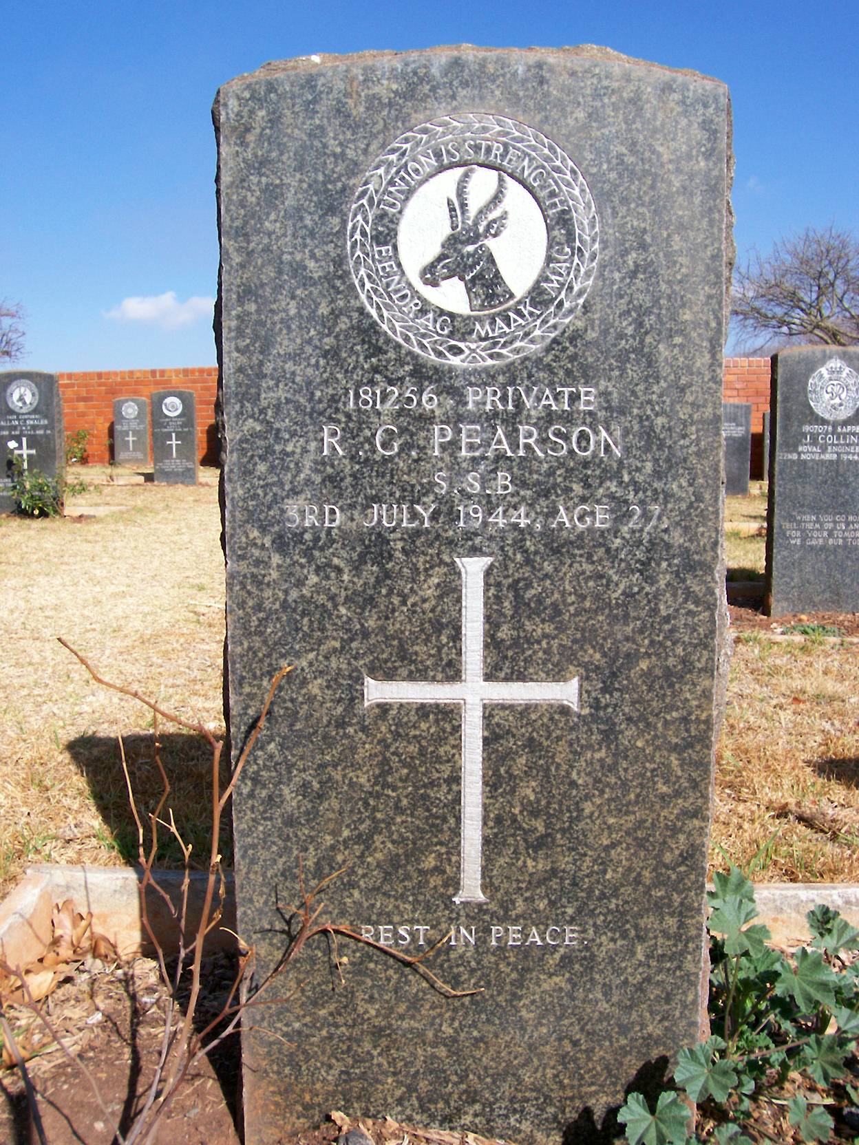 Son of Bernard J. Pearson and Kathleen M. Pearson, of Whites, Orange Free State. Born in Maitland, Cape Province. A despatch clerk. He was unmarried. |