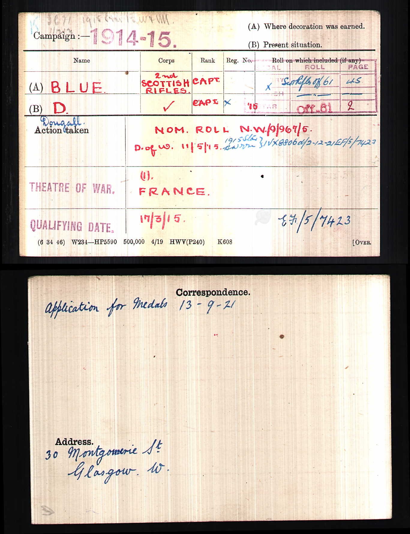 Son of Dugald and Mary Blue, of Glasgow; husband of Katharine A. Blue, of 30, Montgomerie St., Kelvinside, Glasgow. Born Glasgow. Organized and commanded the first ever Cadet Corps in Rhodesia. Held a commission in South Rhodesia Volunteers. ref. South African Roll of Honour 1914-1918