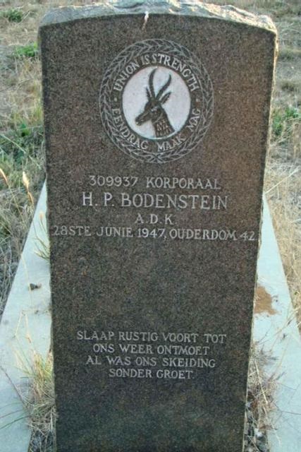 Son of Hermanus Pieter and Martha Margaretha Bodenstein, of P.O. Morgenzon. Husband of Victoria Maria Bodenstein, of Pretoria. Born Standerton District