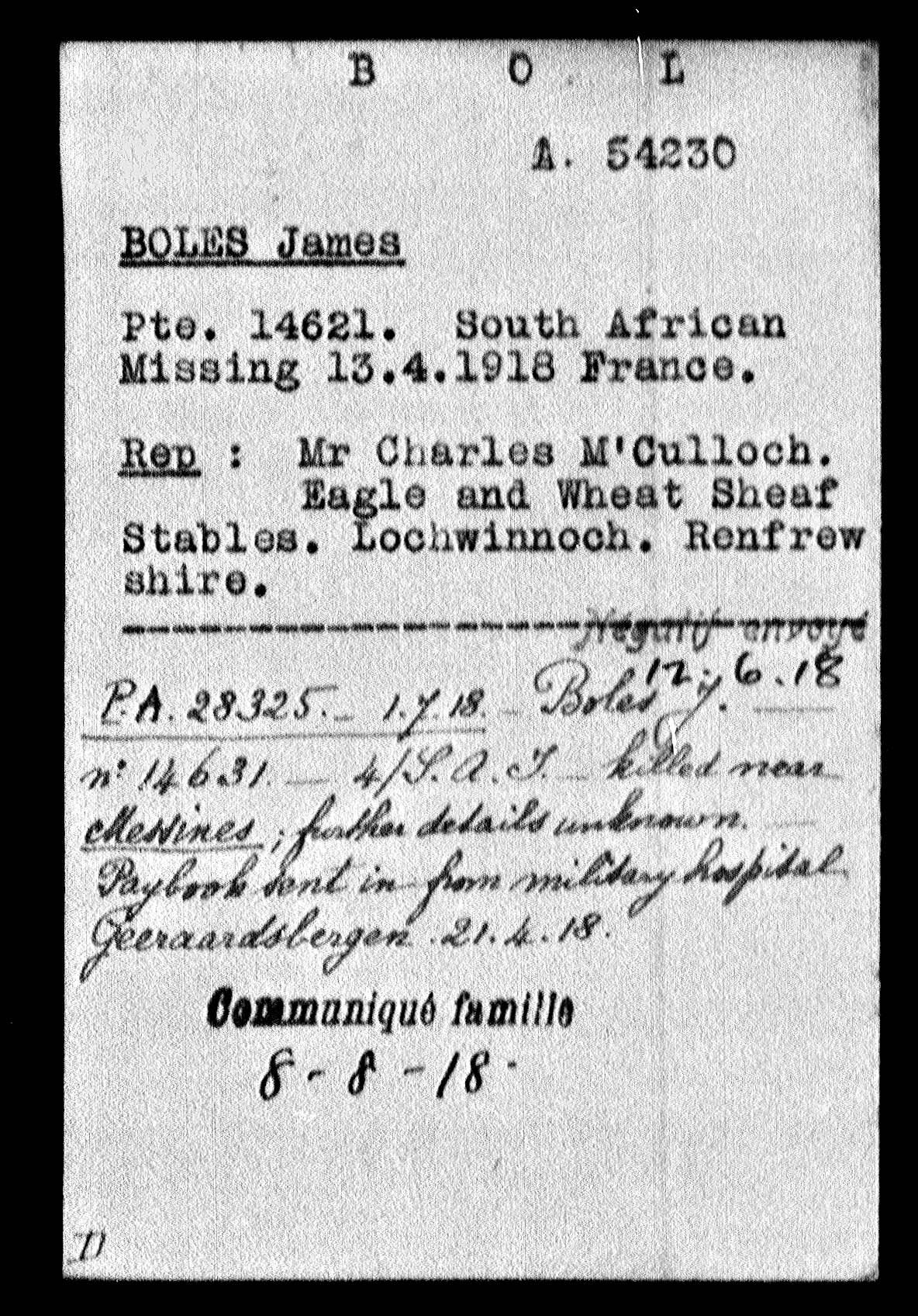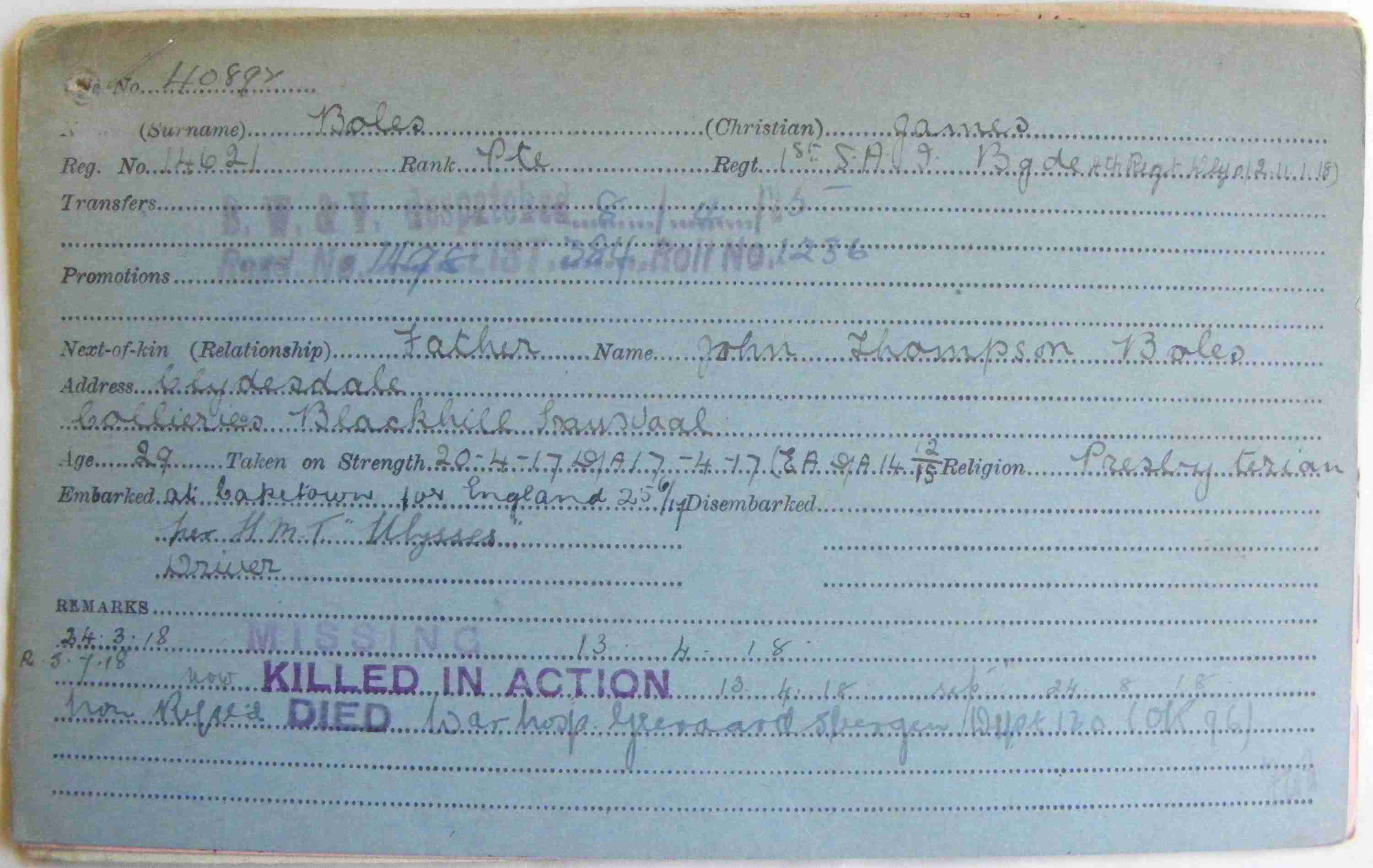 Son of John Thompson Boles and Christina Montgomery Boles, of Clydesdale Colliery, Blackhill, Transvaal. Born Dalserf, Lanark, Scotland. A driver