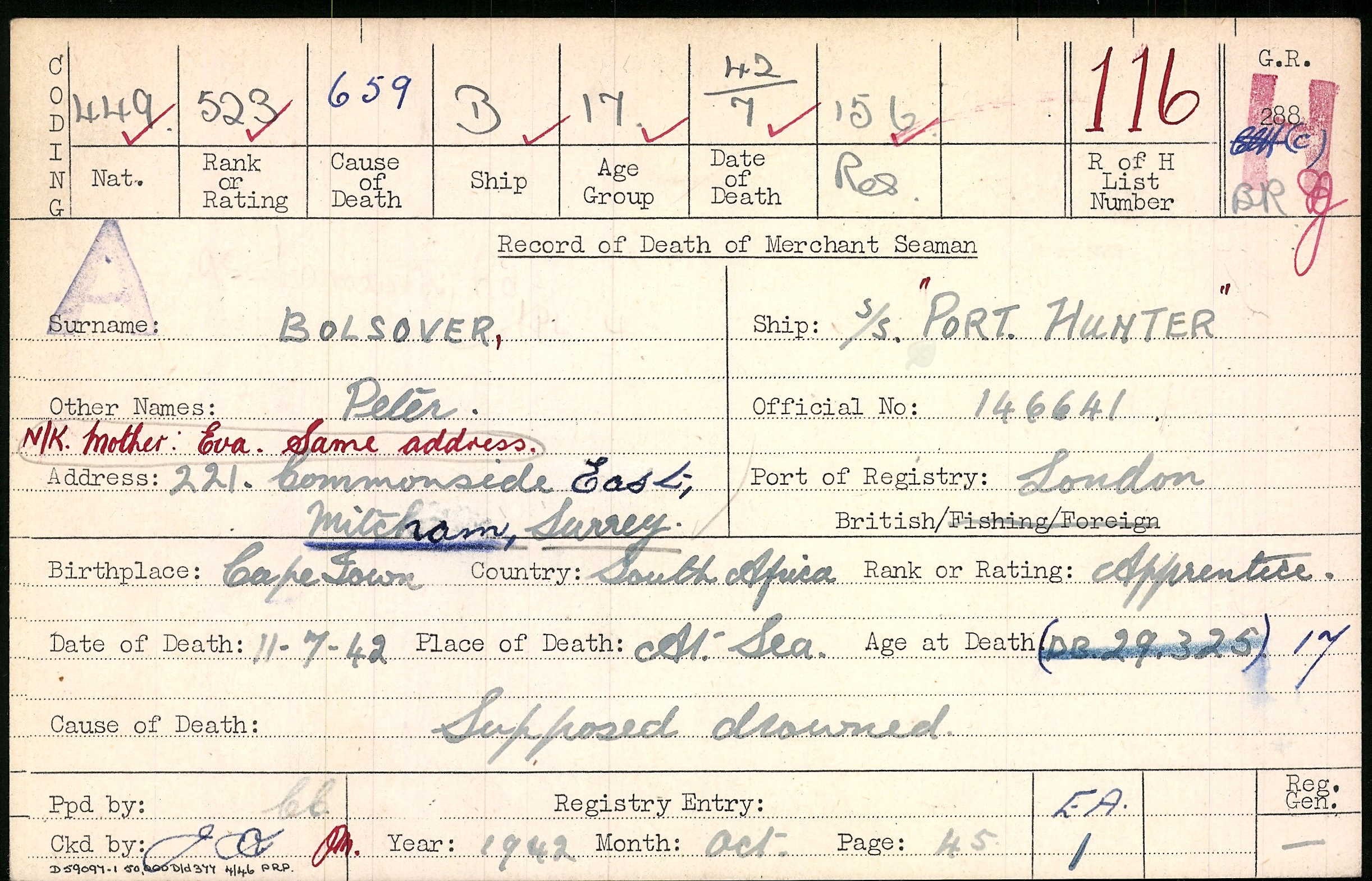 Killed in action, at 01.47 hours on 12 July 1942 the Port Hunter (Master John Bentham Bradley), dispersed from convoy OS-33 at 11.00 hours on 11 July, was struck on the port side in #2 hold by one of two torpedoes from U-582 about 370 miles west-southwest of Madeira. The ship had been missed by a first spread of two torpedoes at 01.15 hours. The torpedo ignited the cargo of ammunition and the vessel disappeared after several heavy detonations, which were seen as flashes at the horizon by other ships of the dispersed convoy. A lot of debris was blown into the air and hailed down on the nearby U-boat, forcing it to dive immediately. In the meantime, the ship listed heavily to port and sank within two minutes. The motor launch HMNZS ML-1090 was lost with the vessel. When the U-boat surfaced again after 20 minutes, only burning fuel oil and wreckage were spotted at the sinking position. At daylight, the Germans examined U-582 and discovered that the net deflector had been torn away when hit by a side plate of the steamer, which was found on deck together with parts of guns and ammunition and an anchor chain hanging over both sides. The falling debris had ruptured the deck at several places and opened leaks in a fuel tank, causing a trail of oil for a while. The master, 68 crew members, 14 gunners and five passengers were lost. Three crew members sleeping on deck had been blown into the water and clung to wreckage of the motor launch until they were picked up at about 08.30 hours by HMS Rother (K 224) (Cdr R.V.E. Case, DSC and Bar, RD, RNR) after being spotted by the British steam merchant City of Windsor from the same convoy |