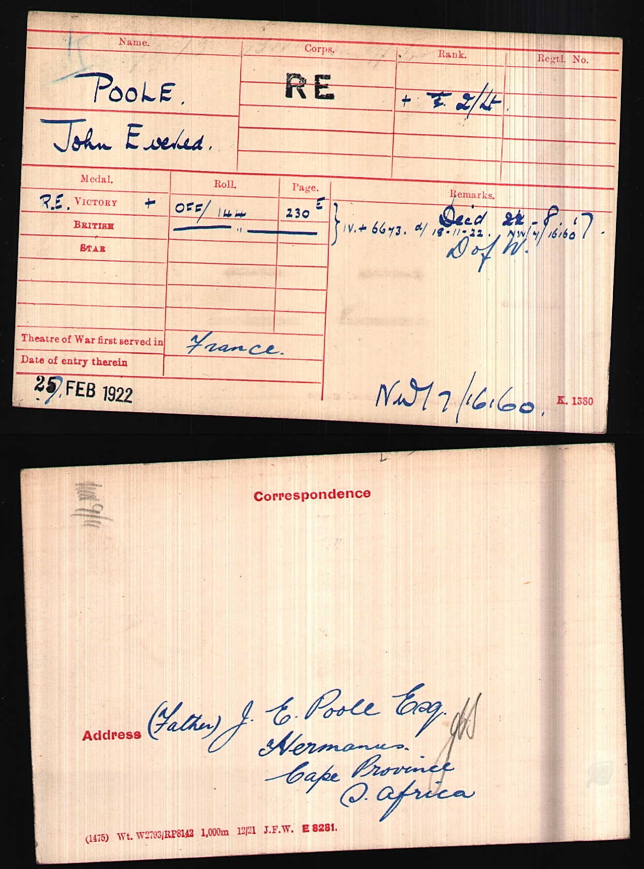 Only son of John Evered Poole and Henrietta Poole, of Mossel River, Hermanus, Cape, South Africa. Born Wortelgat, Caledon, South Africa. On Hermanus War Memorial