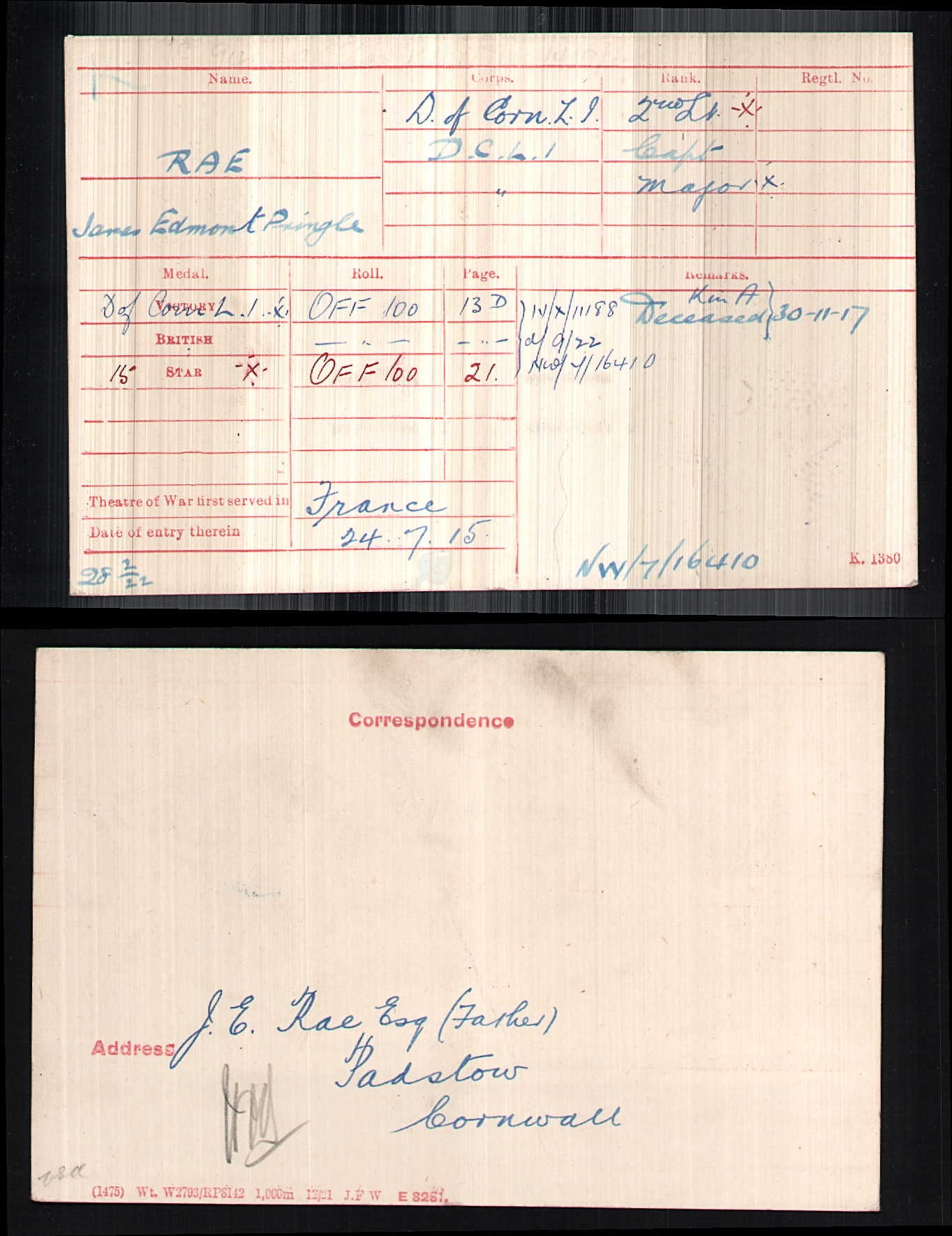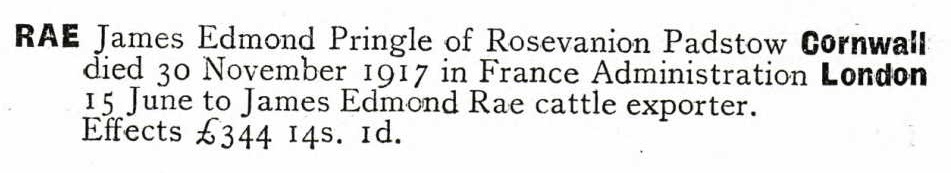 Son of James Edmond and Constance Eileen Mary Rae, of Rosevanion, Padstow, Cornwall. Scholar of Worcester College, Oxford. On active service from Aug., 1914, without a break and was killed when in command of, and rallying his Battalion. ref. South African Roll of Honour 1914-1918