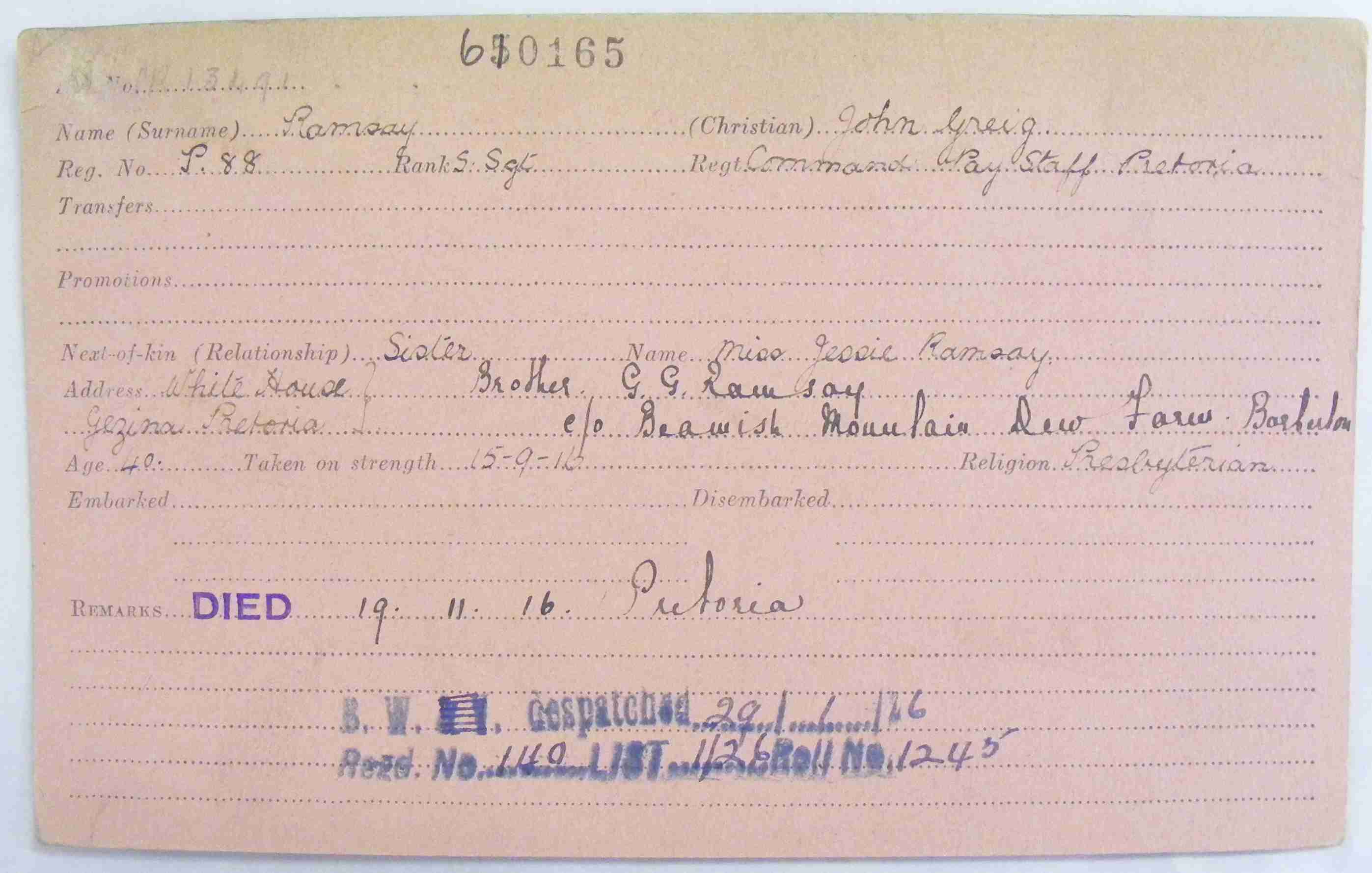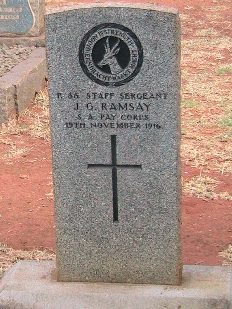 Second son of the late J. Ramsay. Brother of Miss Jessie Ramsay, of Gezina, Pretoria. Brother of Mr. G. G. Ramsay, Mountain Dew Farm, Barberton. Born in Edinburgh in 1873, and attended George Watson's College in 1879-89. He was trained as a Chartered Accountant, but his health breaking down, he emigrated to South Africa in 1896. He served during the Boer War, and on the outbreak of the late war joined the S.A.I., with which he campaigned in German South West Africa. At the time of his death he was employed in the audit department of the Command Paymaster's office at Pretoria. On Barberton War Memorial |