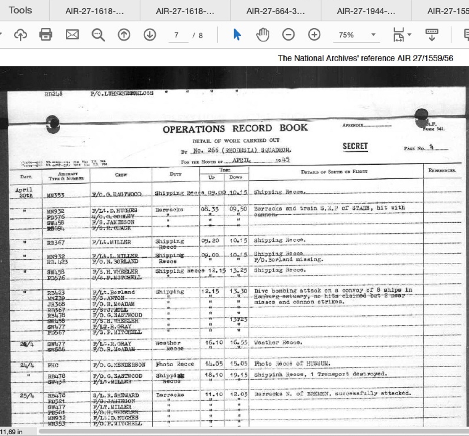 Killed in action, Typhoon RB423:ZH-S. Hit by flak NE Leer, shipping recce