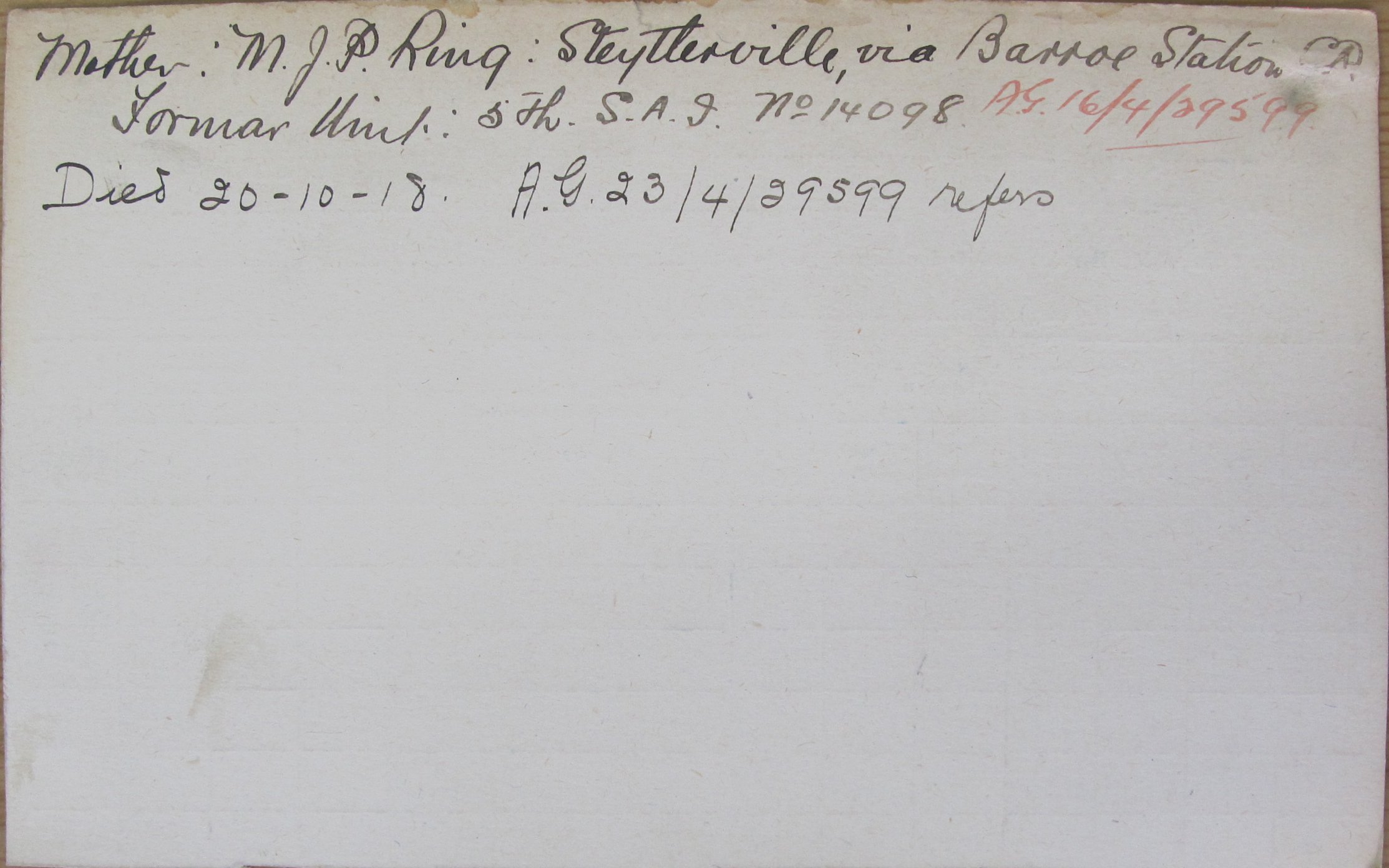 Son of Maria J. P. Ring, of Steytlerville, Barroe Station, Cape Province, and the late William Henry Ring.