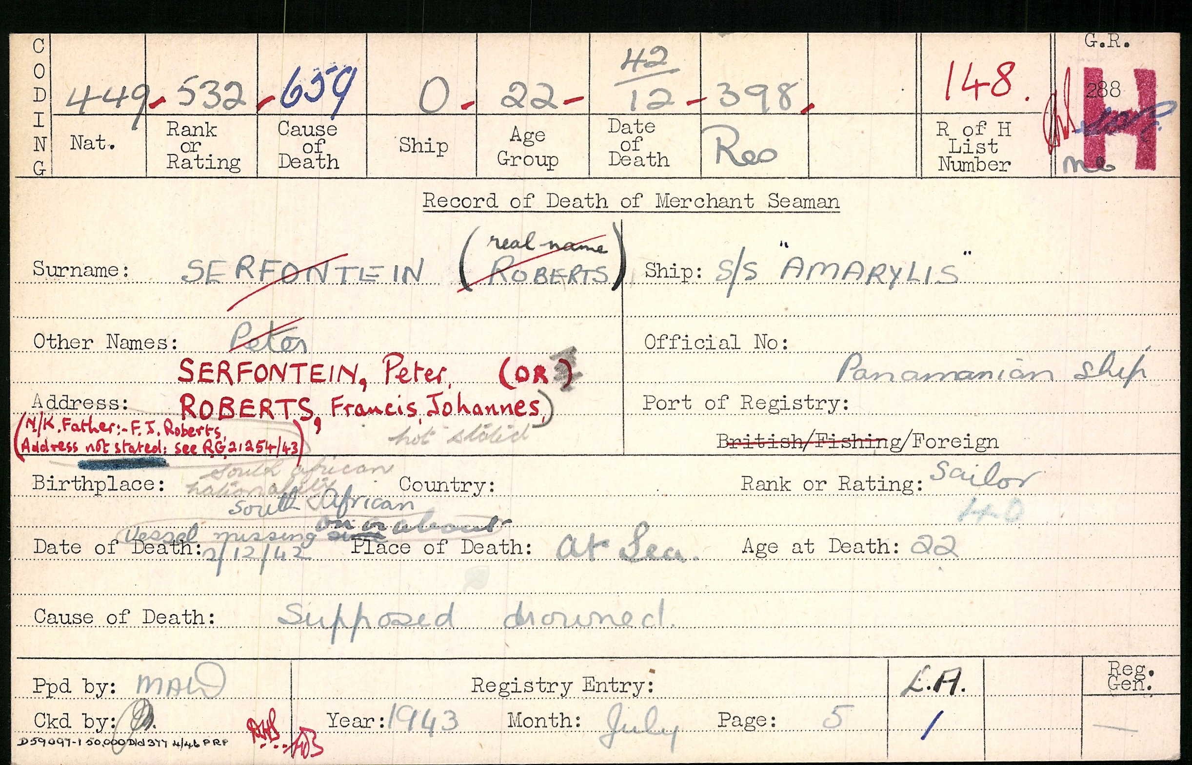 Son of Mrs. F. J. Roberts, of Birchleigh, Transvaal, South Africa. (Also served as Peter SERFONTEIN) |