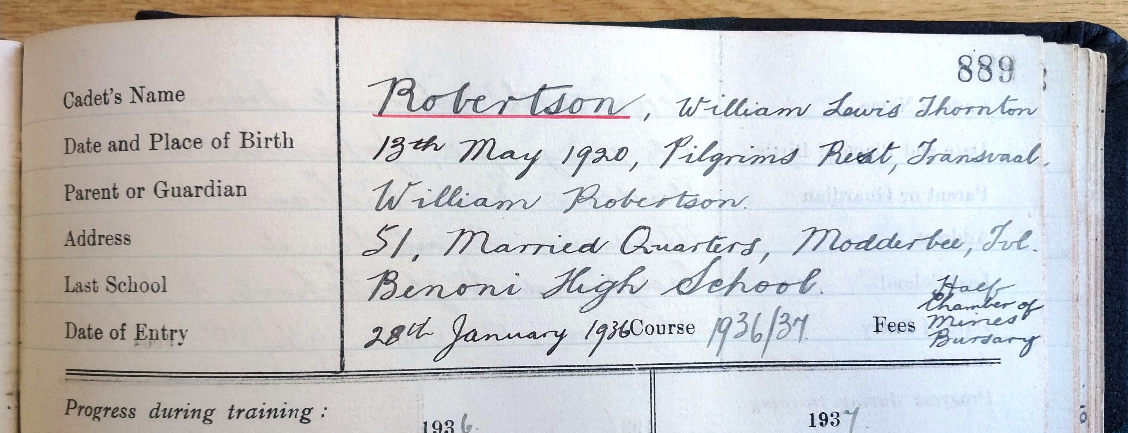 Son of William and Annie Robertson. Born Pilgrims Rest, Transvaal. Ex-Cadet of the South African Training Ship General Botha |