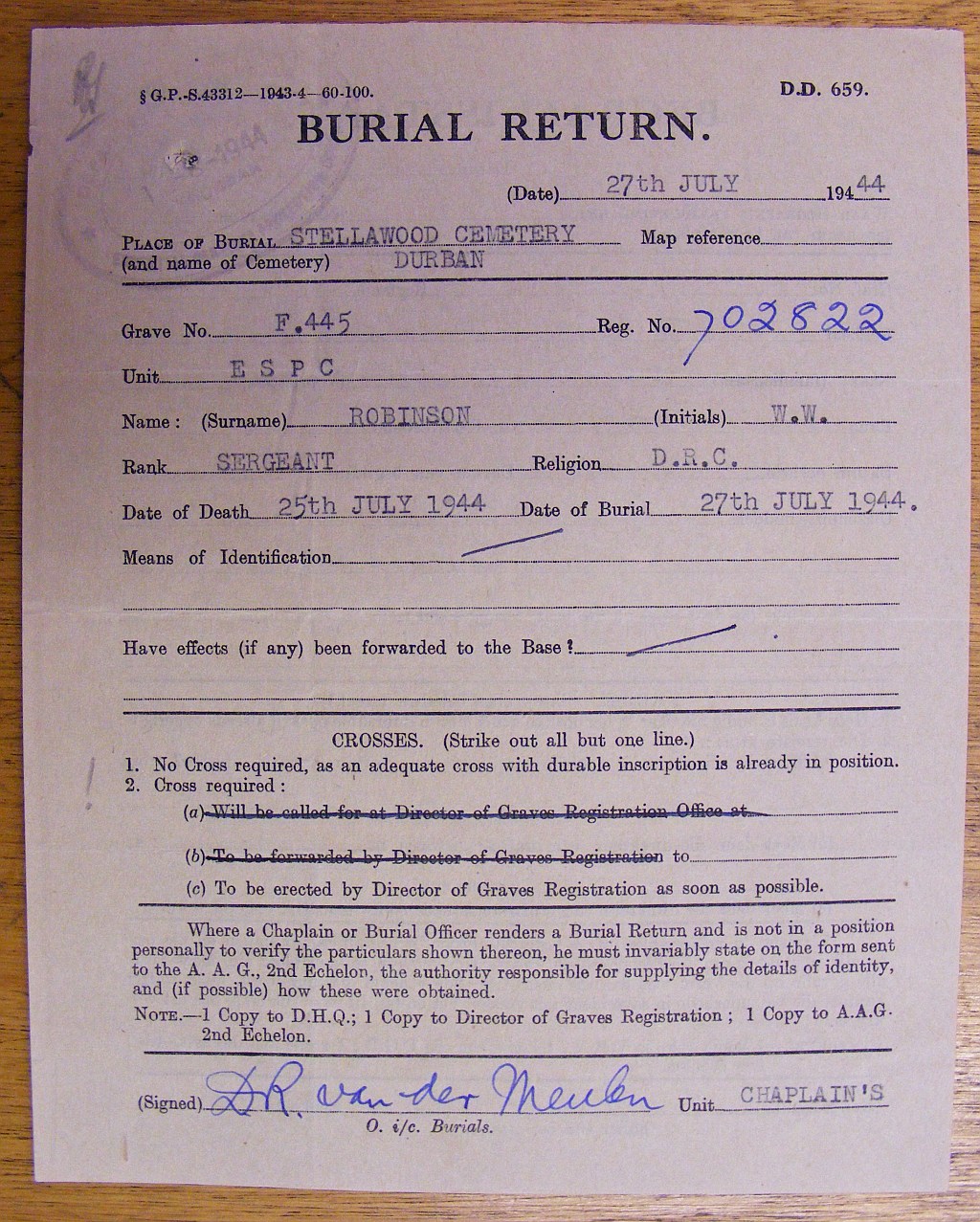 Died of heart failure, at the Springfield Military Hospital, Durban. |