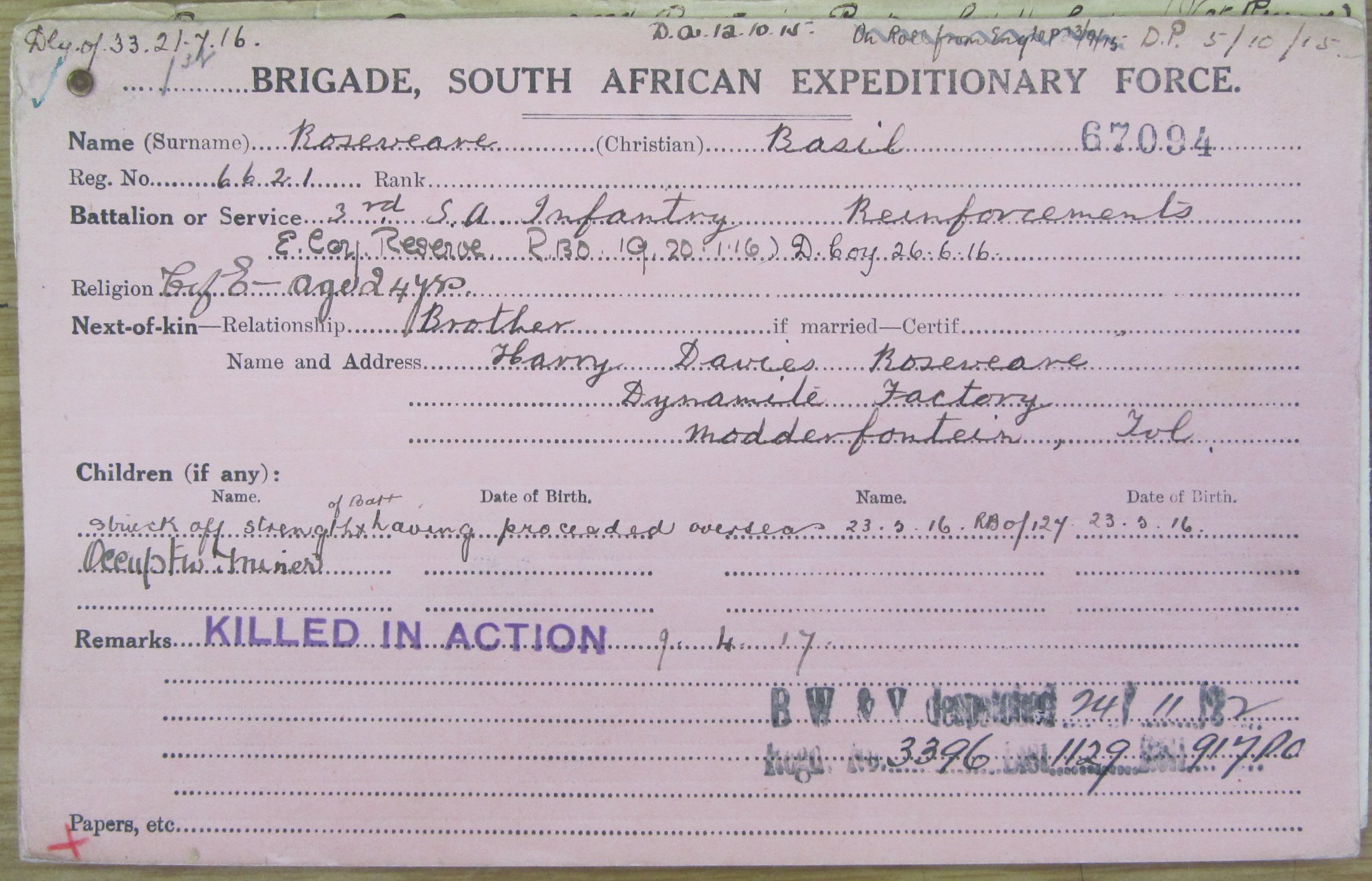 Killed in action, during first day of the Battle of Arras. The 3rd S.A.I. was on the right of the South African Infantry Brigade in the attack of Black Line and Blue Line (North of St Laurent-Blangy). The 3rd S.A.I. sustained 53 killed and 226 wounded |