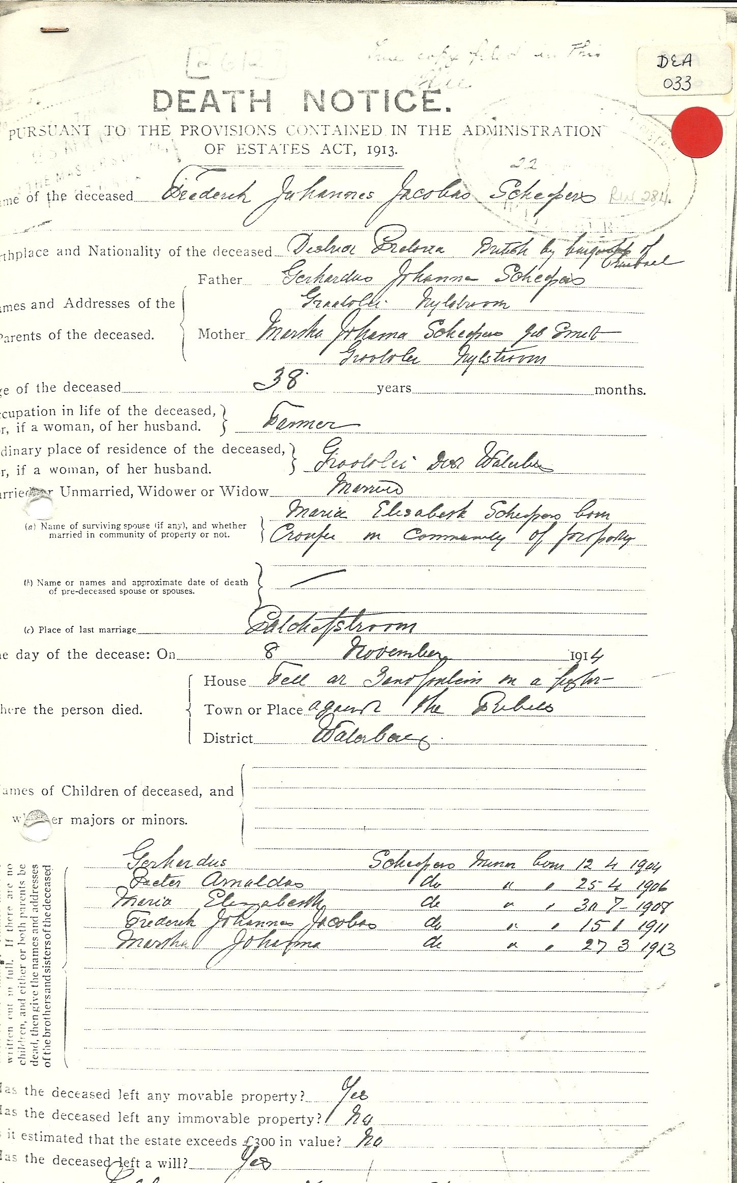 Husband of Maria Elizabeth Scheepers, of Grootvlei, P.O. Nylstroom |