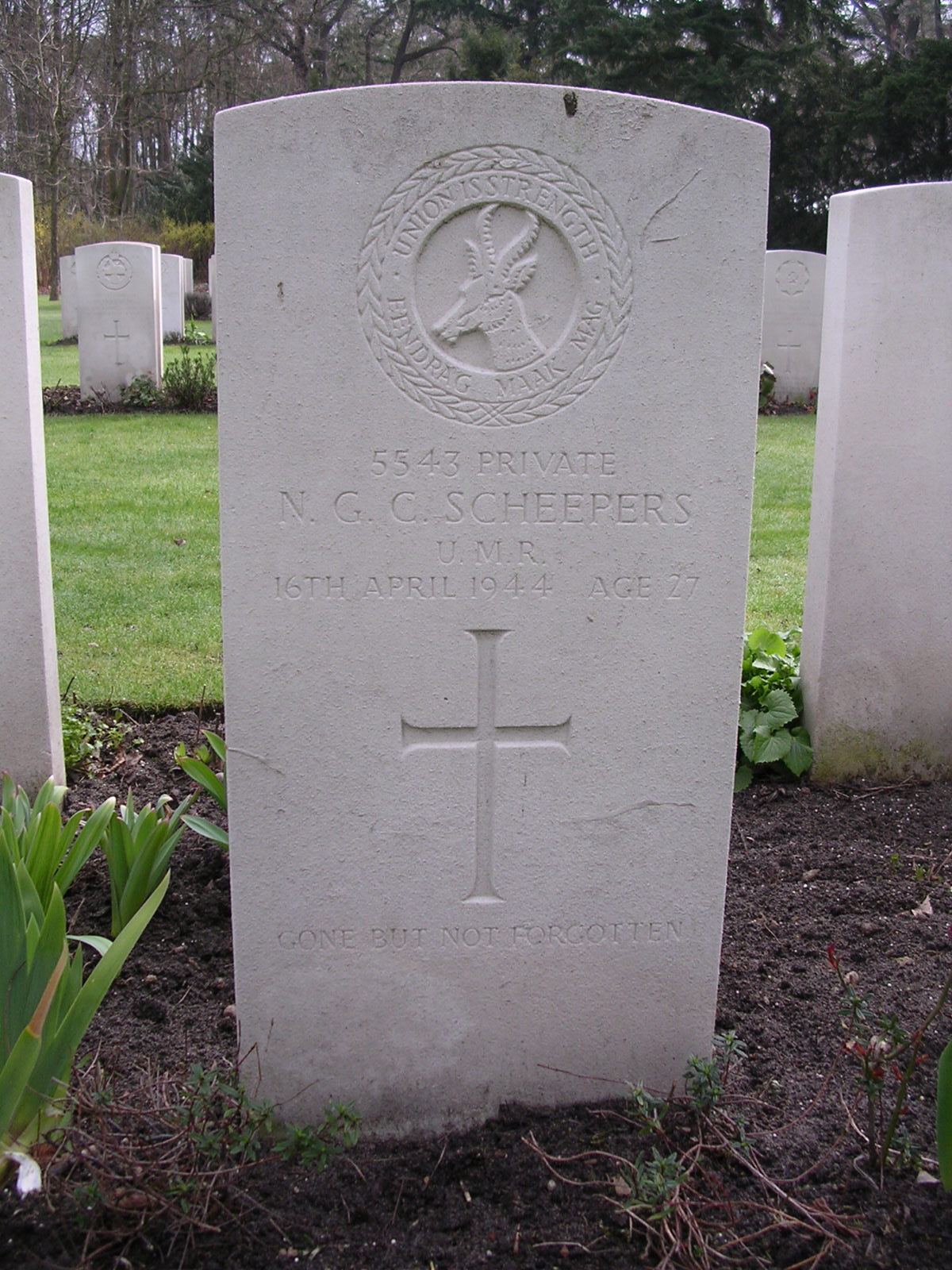 Son of Gideon J. Scheepers and Johanna E. Scheepers; husband of Francis Elizabeth Scheepers, of Southfield, Cape Province, South Africa. Born Harding, Natal