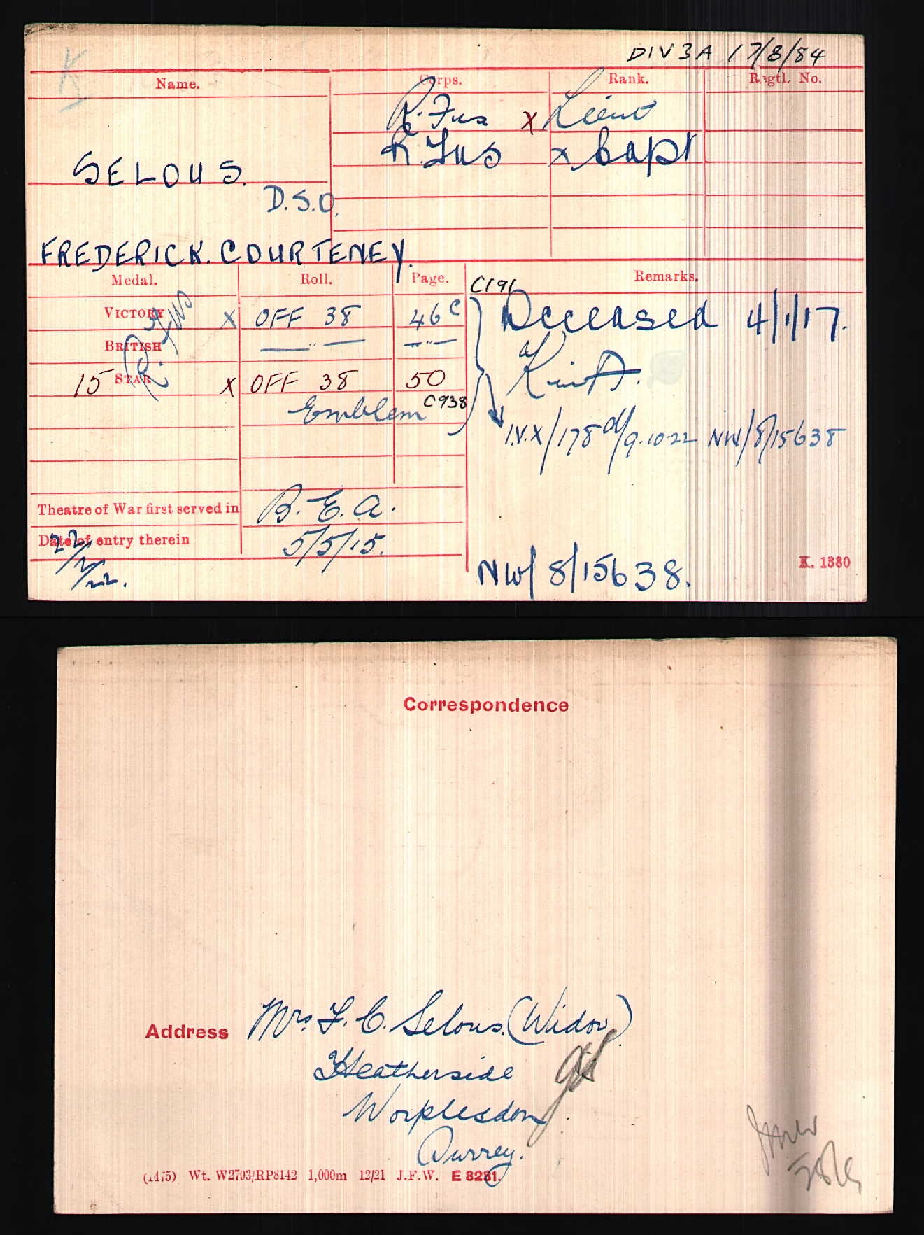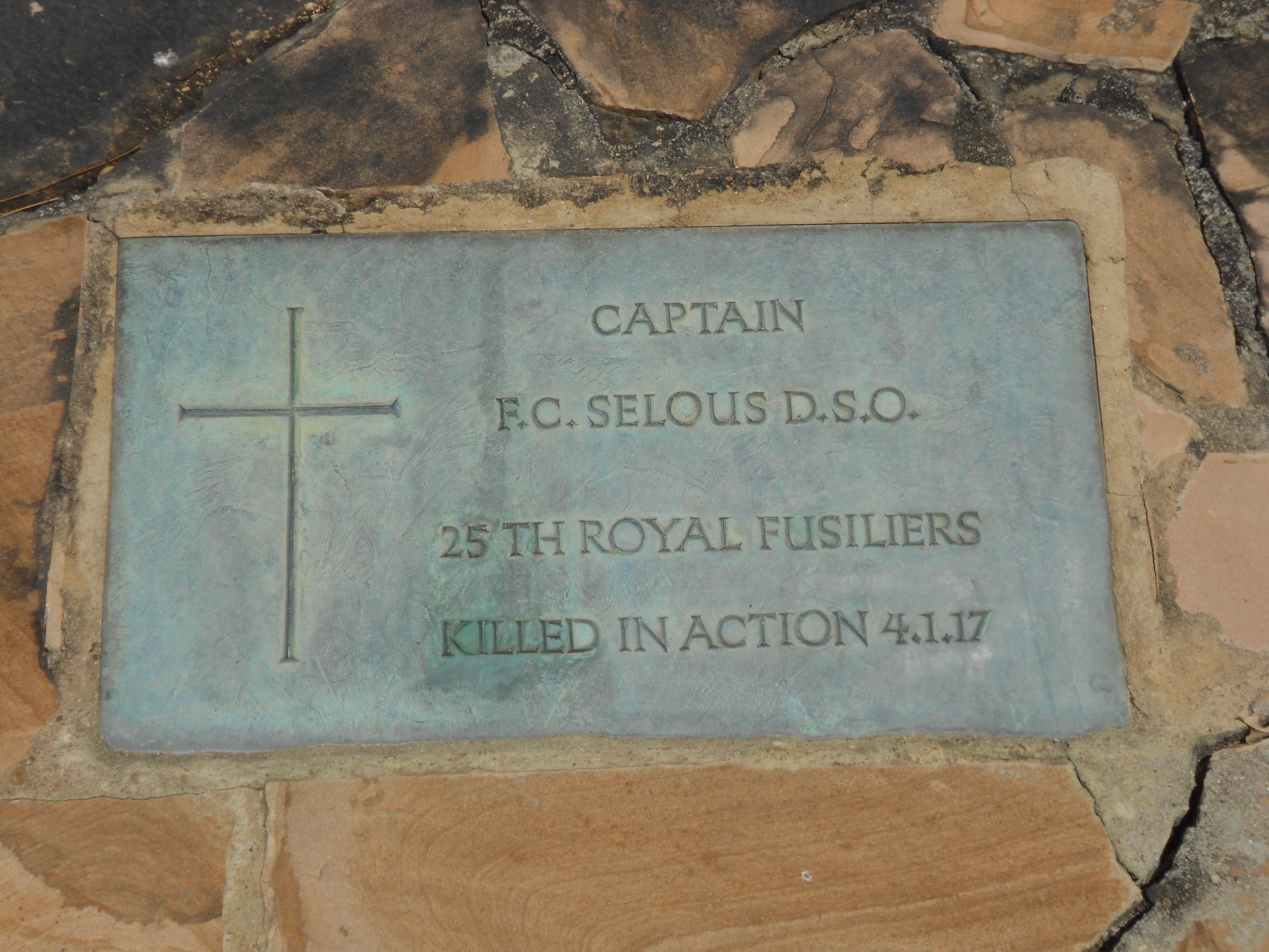 In World War I, at the age of 64, Selous participated in the fighting in East Africa, rejoining the British Army. He was promoted to Captain in the uniquely composed 25th (Frontiersmen) Battalion, Royal Fusiliers on 23 August 1915. Ref. South African Roll of Honour 1914-1918. |