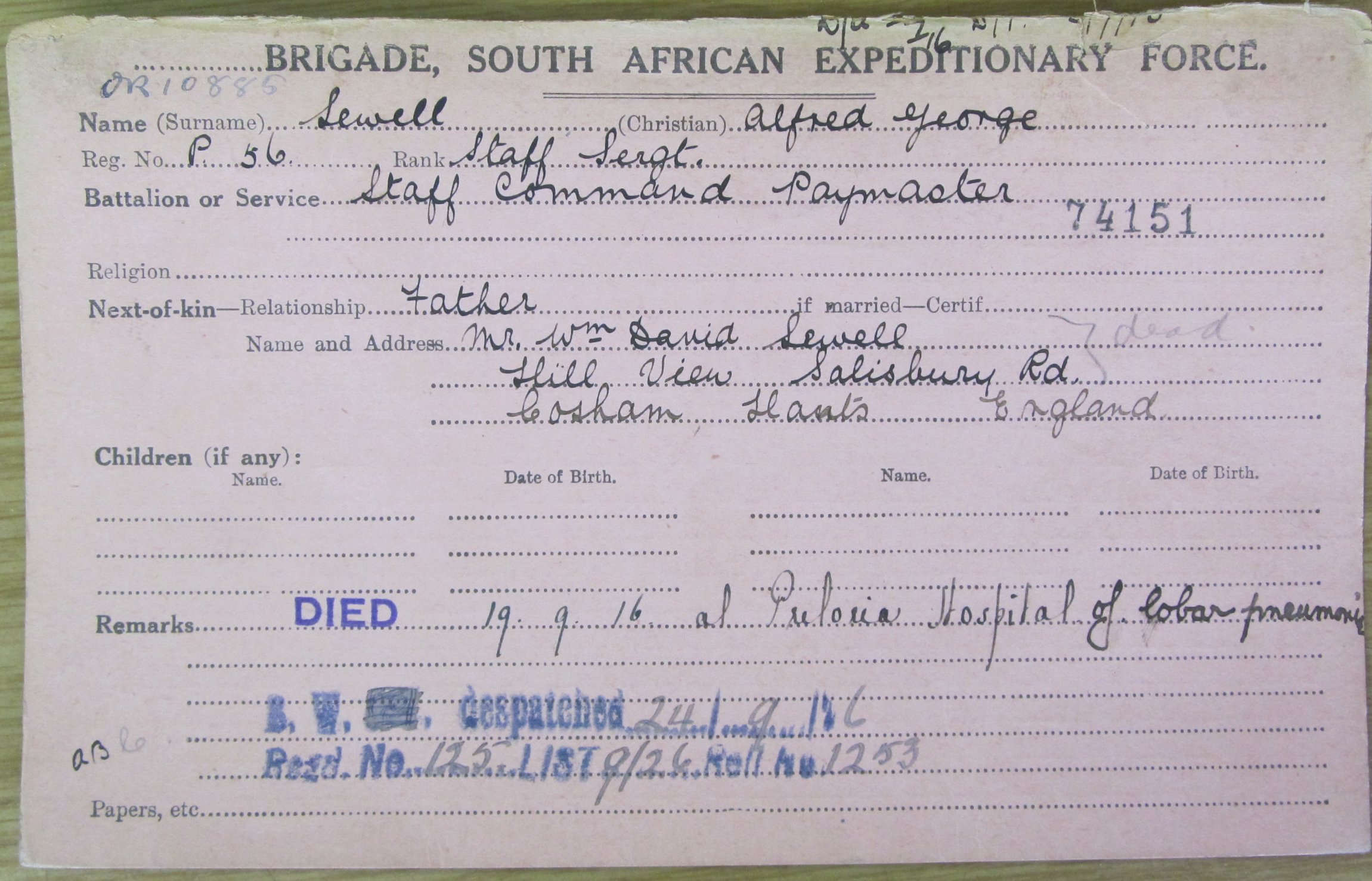 Son of William David and E. E. Sewell, of Hillview, Salisbury Road, Cosham, Hants, England. Born at Cape Town.