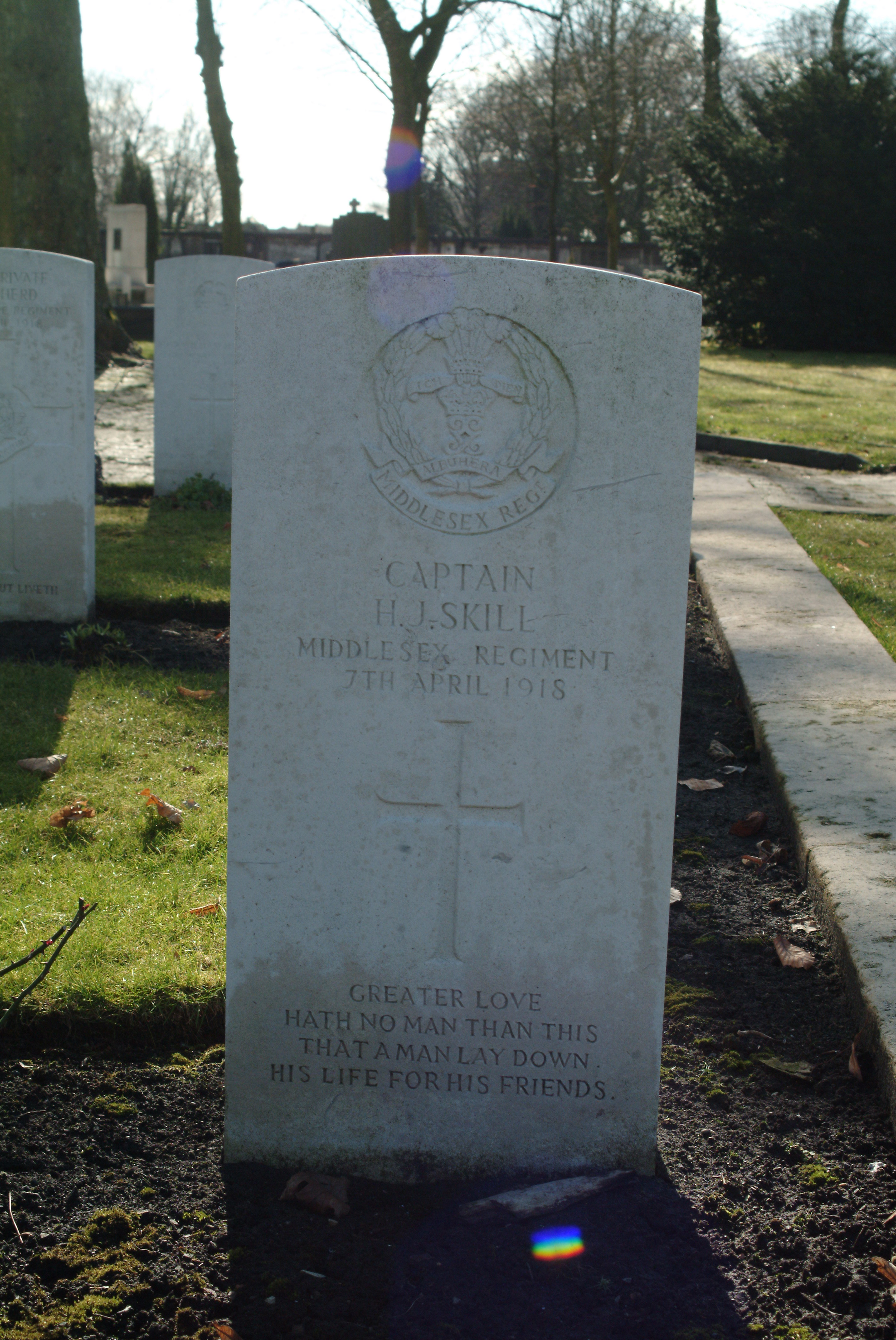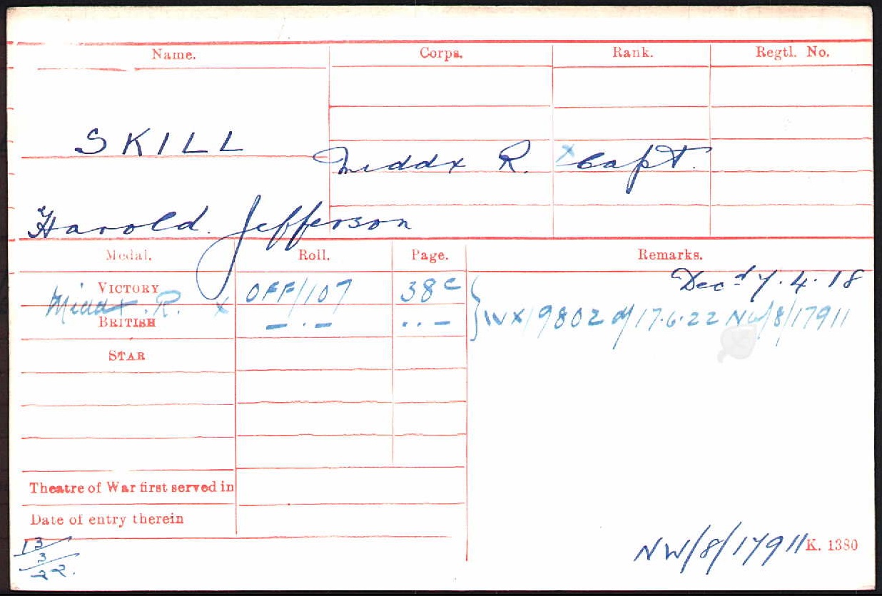 Son of Mr. Octavius Skill, of Africa; husband of Elizabeth Anne Skill, of 38, Argyll Rd., Kensington, London. Also served in German East Africa and in the South African Campaign. Brother of Miss V. A. Skill, of the Old Hospital, Salisbury, Southern Rhodesia. ref. South African Roll of Honour 1914-1918