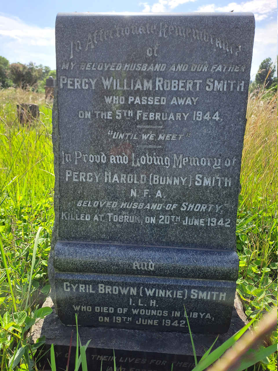 Son of Percy William Robert and Alice Maud Smith, of "Avalon", P.O. Umhlanga Rocks, Natal. Husband of Esther Enodia Smith, of Bower Street, Brooklyn, Cape Town. Born Fort Beaufort. A male nurse at the Town Hill Mental Hospital, Pietermaritzburg. His brother also died on service. Pietermaritzburg (Mountain Rise) Cemetery