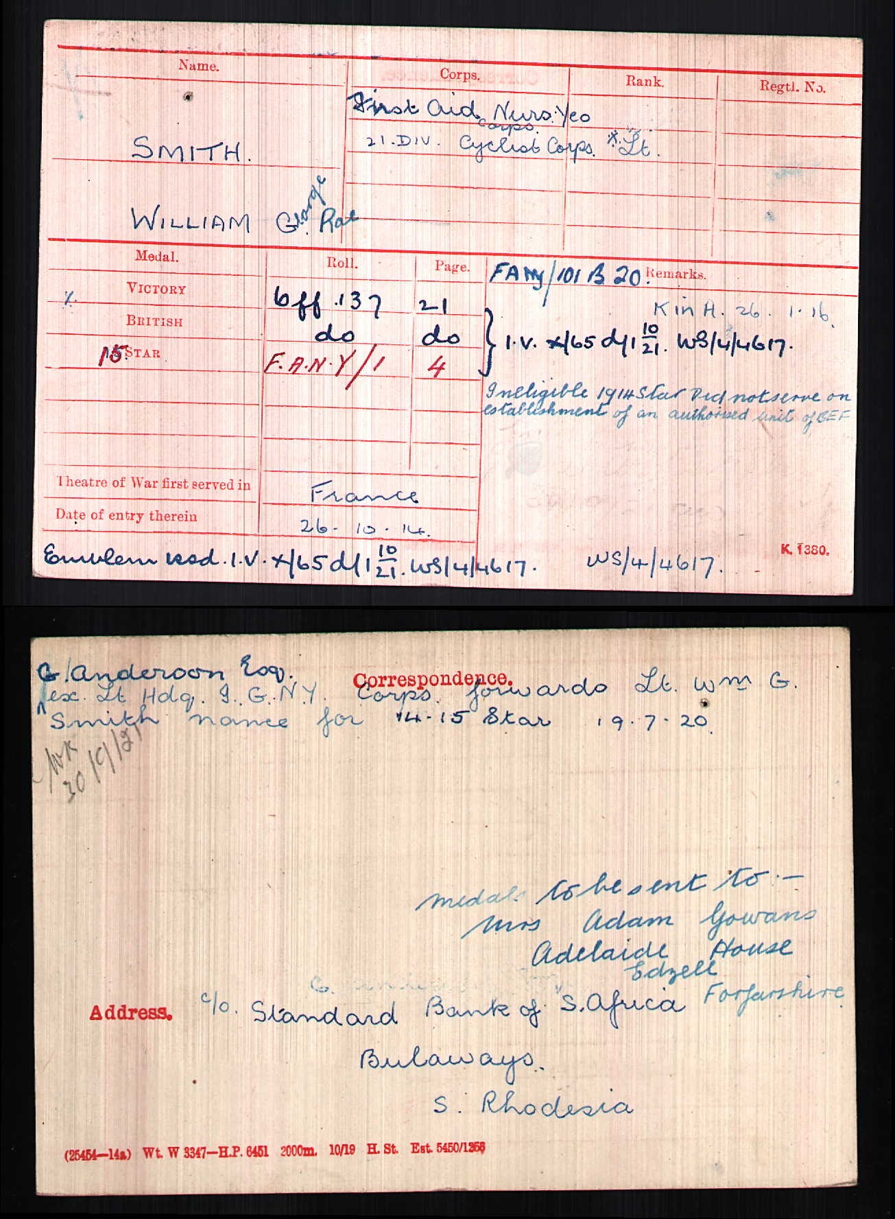 Son of Charles Smith, merchant, of Aberdeen. Husband of Beatrice Stuart Rae Gowans (formerly Smith), of Adelaide House, Edzell, Brechin, Forfarshire. Born Aberdeen. Educated at the Grammar School ; student in Agriculture, 1904-05, and 1908-09. Between these years he was for some time in New Zealand sheep farming, and while still very young did some exploring and trading in New Guinea and the South Sea Islands. Later he led a small expedition through Patagonia, his report on this journey was published in the Magazine of the Royal Scottish Geographical Society. After his second period as a student in Agriculture he carried on stock farming in Rhodesia. He was an enthusiastic member of the Legion of Frontiersmen, of which he acted for a time as Commandant for Scotland, and raised companies in Aberdeen and Edinburgh. On the outbreak of war he hurried home from Rhodesia and was in rapid succession a member of a New Zealand Corps, an ambulance driver on the Belgian Front, and a horse artilleryman. In February 1915 he obtained a commission in the King's Own Yorkshire Light Infantry with which, and the 21st Divisional Cyclists, he served till his adventurous and crowded life was ended on 26 January 1916 while he was carrying back a wounded comrade after a bombing raid. For his conduct on this occasion he was Mentioned in Despatches. He might have been on leave at the time he was killed but wrote home, "What's the good of leave if you haven't done something worth while?" So he sought honour in another gallant adventure and met death. |
