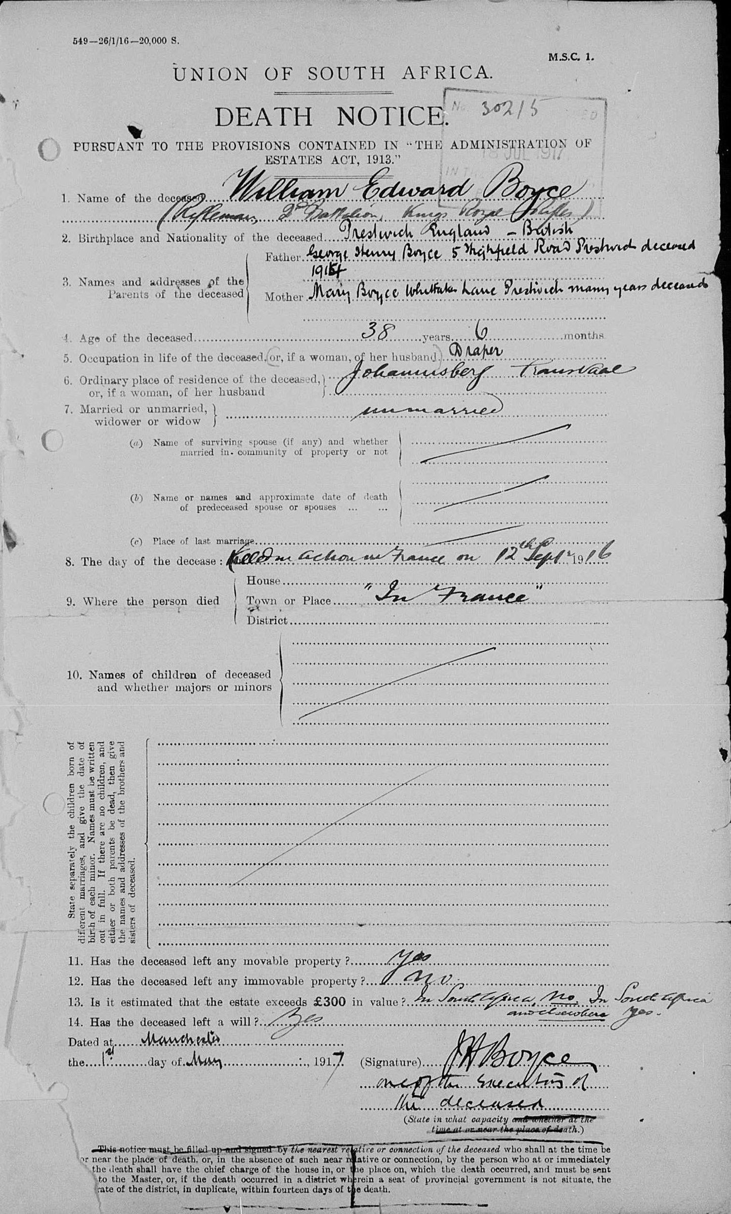 Son of George Henry and Mary Boyce, of Prestwich, Lancs. Resided Johannesburg. A draper. ref. South African Roll of Honour 1914-1918