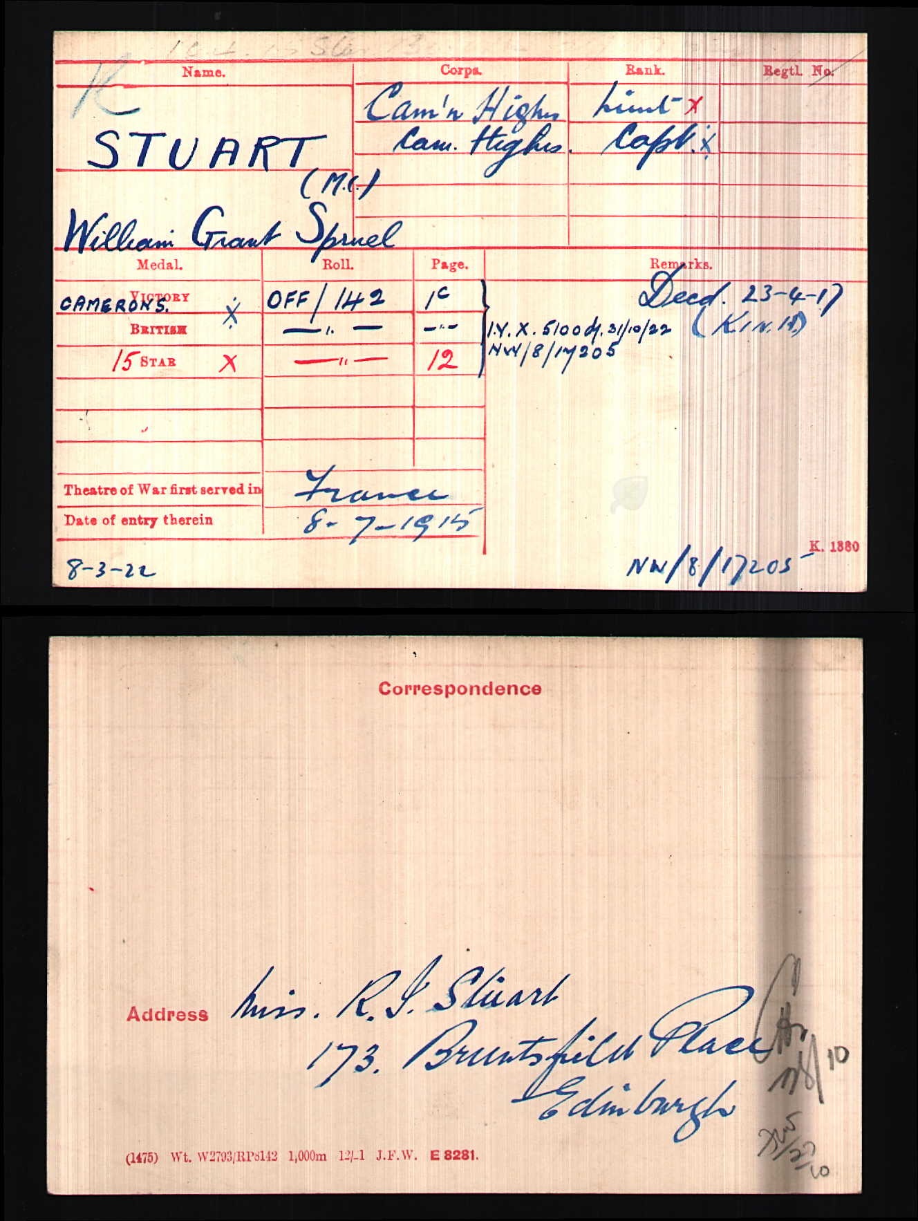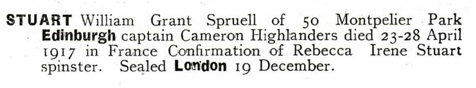 Son of The Reverend W. Stuart, of South Africa. Next of kin, Miss Rebecca Irene Stuart, of 173 Bruntsfield Place, Edinburgh. Born Gartly, Aberdeenshire. Educated George Watson's College, before going up to the University of Edinburgh to read classics. A member of the Watsonian Cricket Club, Stuart also played his club cricket for East and West of Scotland. He was selected to play for Scotland in a first-class match against Ireland at Dublin in 1914. He batted twice in the match and was dismissed for scores of 17 and 10 by Bob Lambert and Gus Kelly respectively. Stuart volunteered for the British Army during the First World War, being commissioned as a Second Lieutenant in the Queen's Own Cameron Highlanders in September 1914, with promotion to Lieutenant following in April 1915. He was promoted to Captain in December 1916 and was awarded the Military Cross in the 1917 New Year Honours List. ref. South African Roll of Honour 1914-1918 |