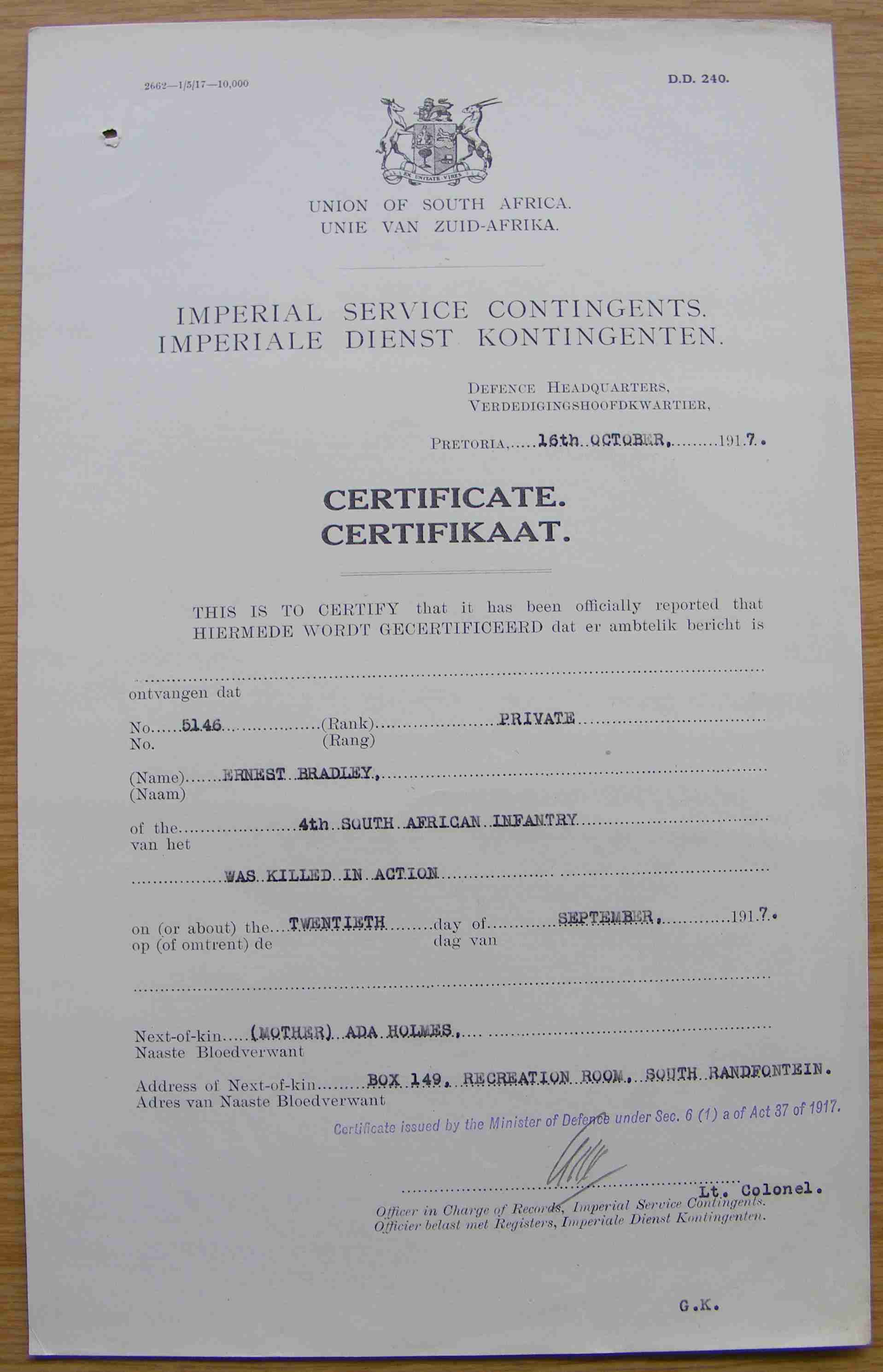 Killed in action, at Third Battle of Ypres (Battle of Menin Road) |