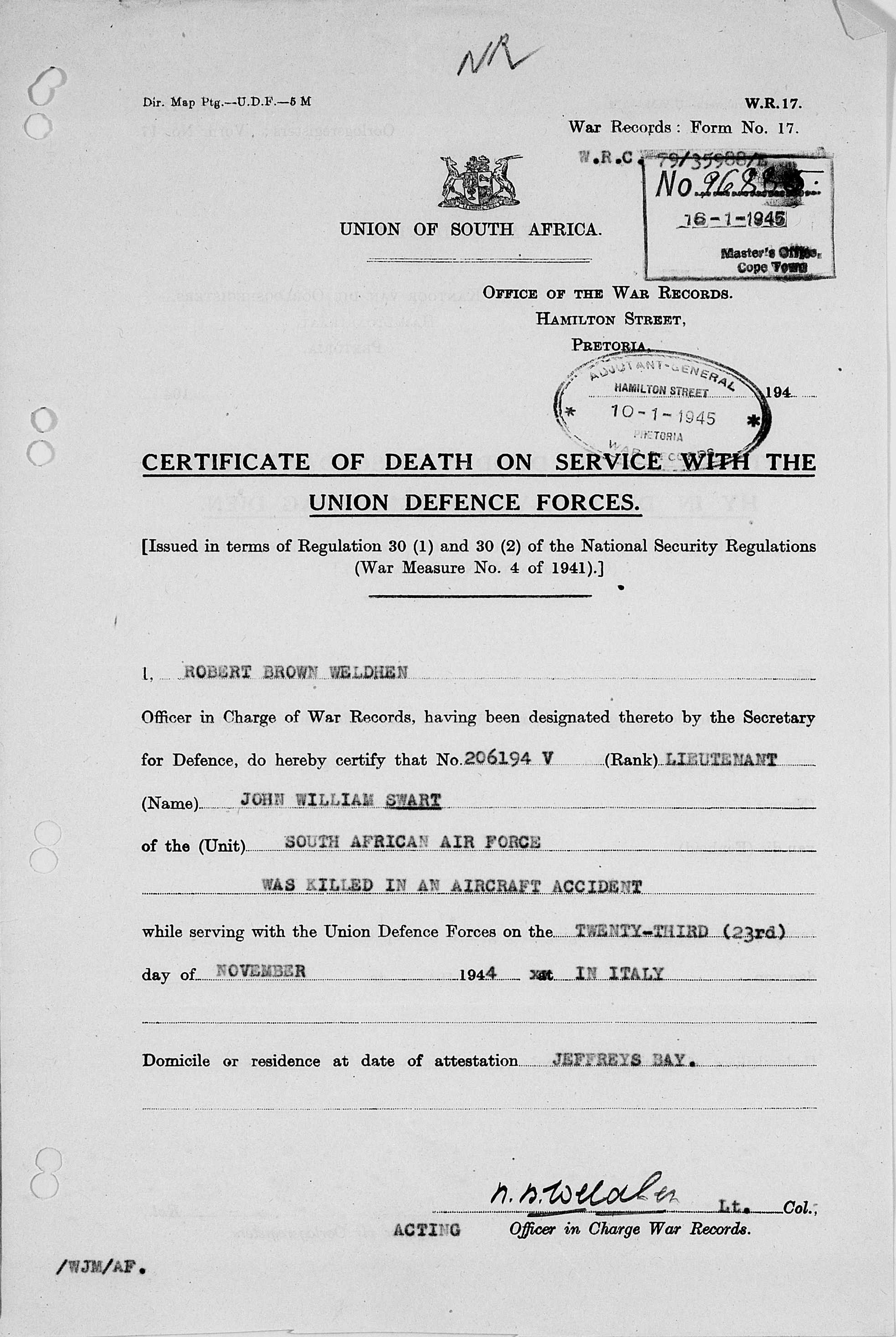 Son of Jacobus Nicolas and Kate Evelyn Swart. Nephew of Cecil and Nellie Swart. His brother also died in service