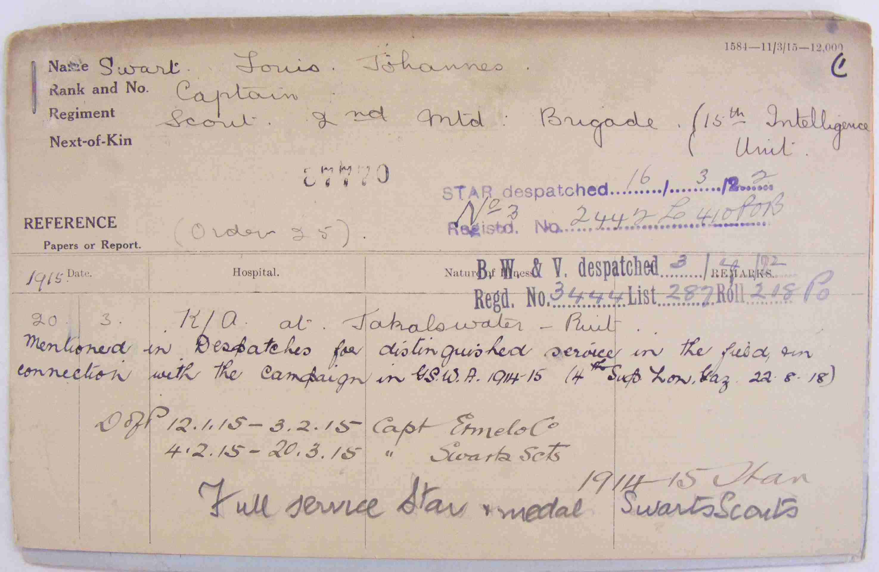 LG Sup 22 August 1918 - "For distinguished service in the Field and in connection with the campaign in German South-West Africa, 1914-15" |
