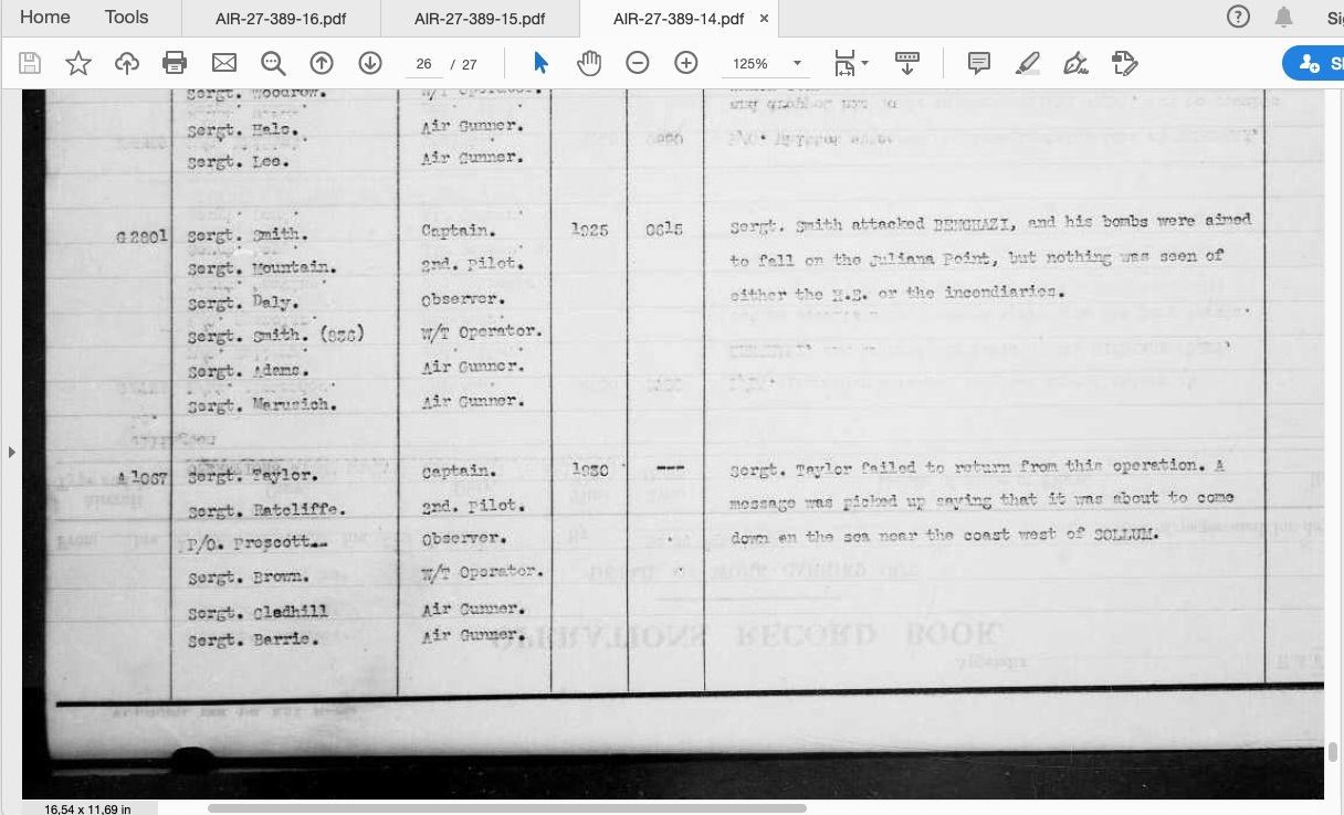 Killed in action, Wellington R1067, aircraft failed to return from operational flight over Benghazi, Libya. Last message received stated that it was about to come down on the sea bear the coast west of Sollum |