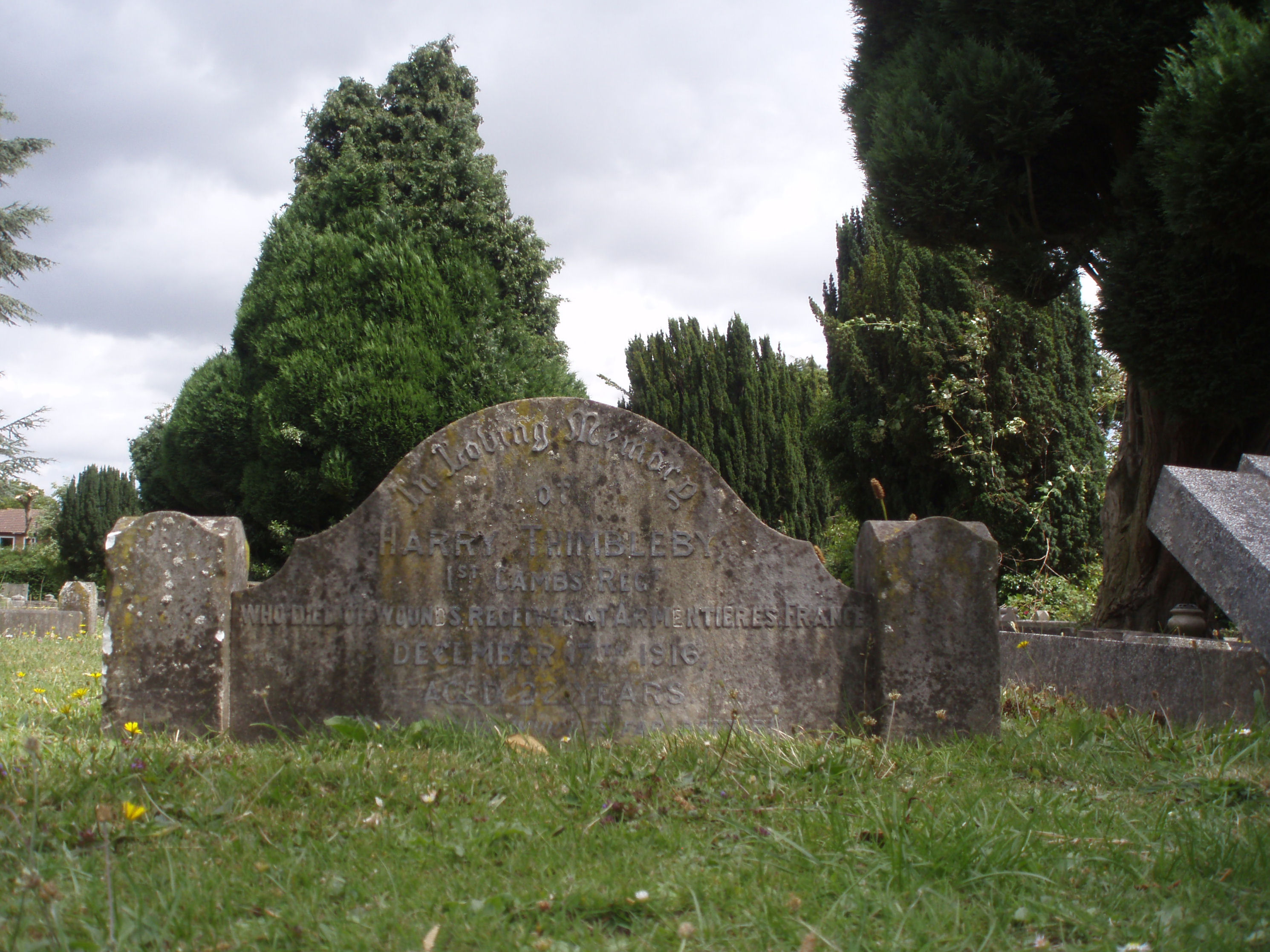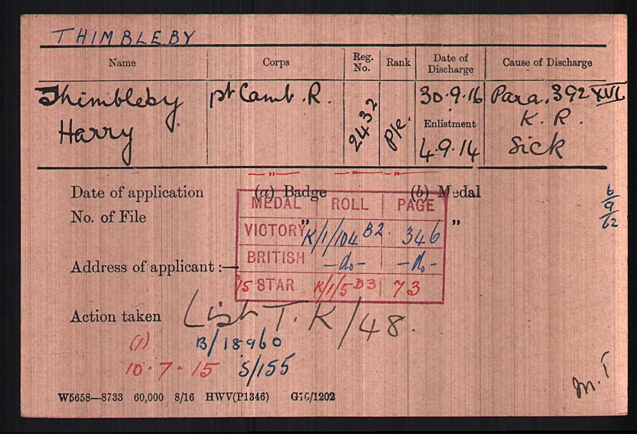 Son of Joseph Thimbleby, of 62 Station Road, March, Cambs. Born at Beaufort West, South Africa and at the time of his enlistment (4th September 1914) he was living at 67 Station Rd, March and he was employed as an engineering apprentice at the Chatteris Engineering Works. Whilst in South Africa he had been a member of the Cadet Corps. He was 5ft 8ins tall. He was posted to France 10th July 1915. Sometime between that date and 6th Sept 1915 he was buried in a collapsed trench suffering a collapsed lung. He returned to England 7th Sept 1915. His records show him as suffering from bronchitis, pneumonia and asthma which resulted in him attending various military hospital including Shornecliffe. He was discharged as being permanently unfit for further service 30th September 1916. He is shown as living in Truro at the time of his discharge. He died at 67 Station Road, March from pneumonia and heart failure. His father Joseph was present at his death. Listed on the March War Memorial |