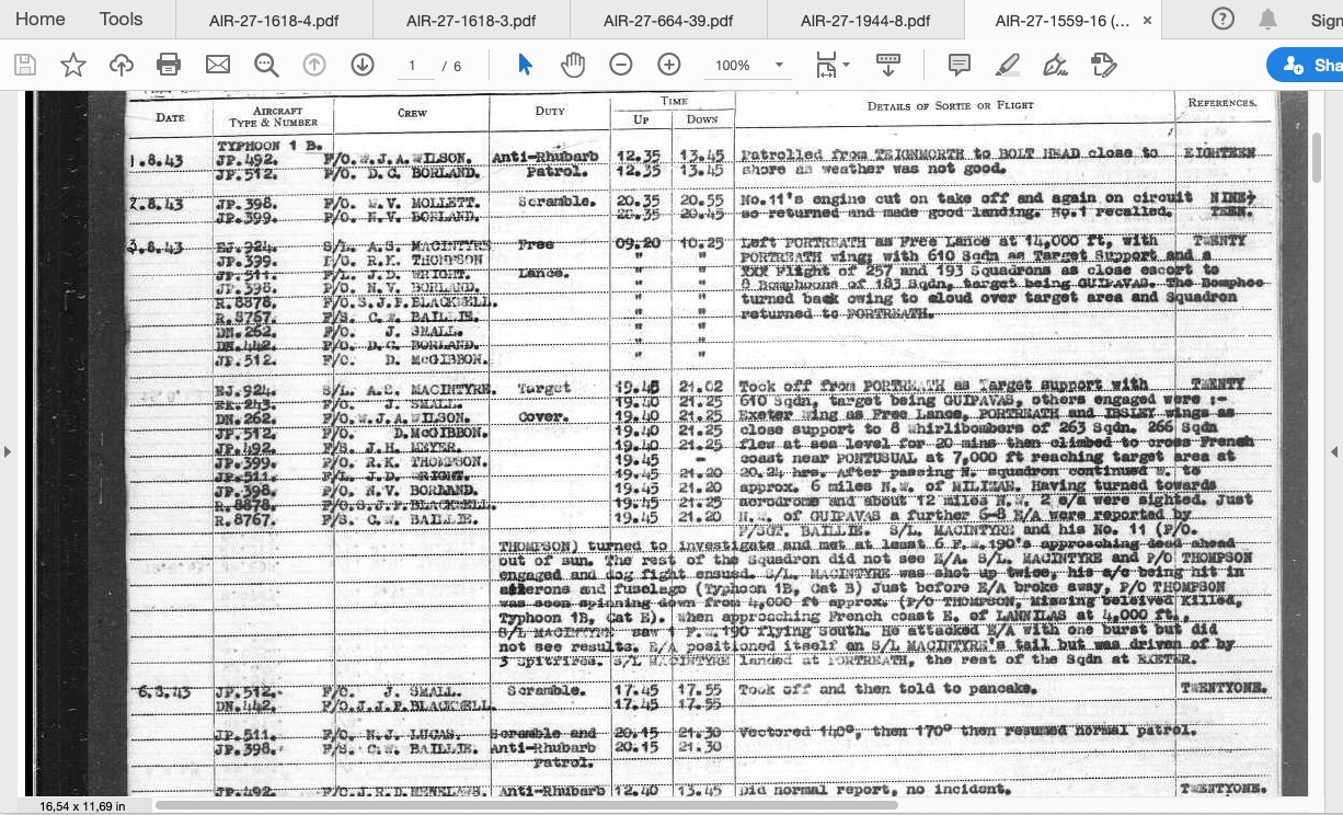 Killed in action, Typhoon 1B JP 399, engaged 6 FW 190s and seen spinning into ground
