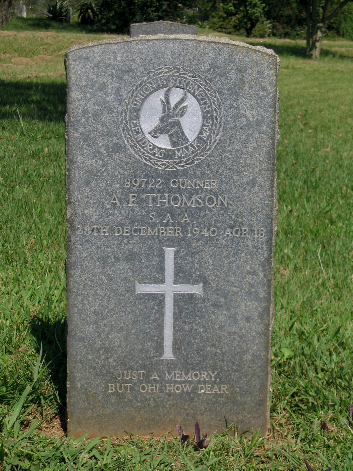 Son of George Archibald and Mary Agnes (nee Heppes) Thomson, of Pietermaritzburg. Born Natal. An apprentice builder. |