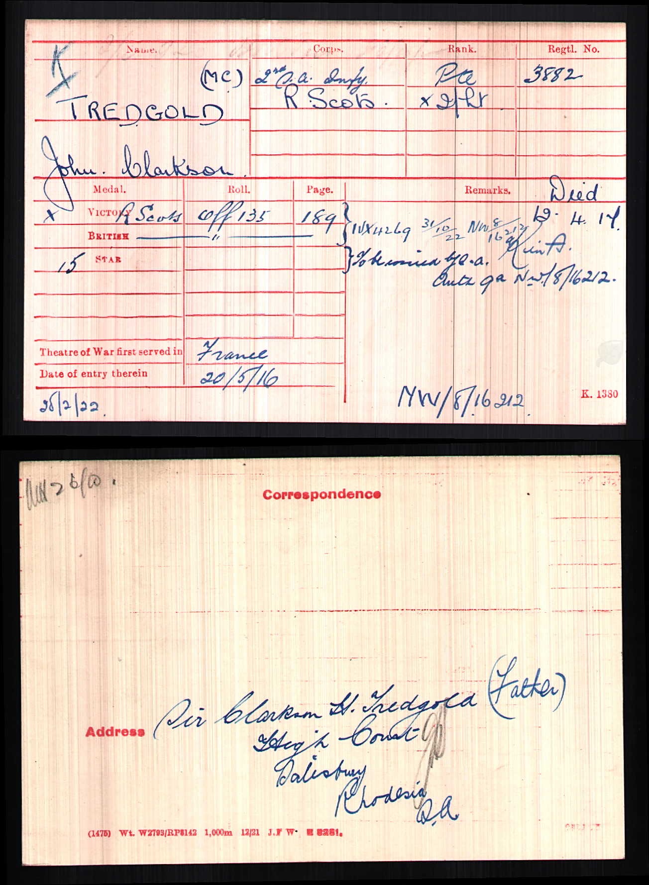 Son of Clarkson Henry Tredgold and Emily Ruth Tredgold, of Cressydale Lydiate, Southern Rhodesia, South Africa. |