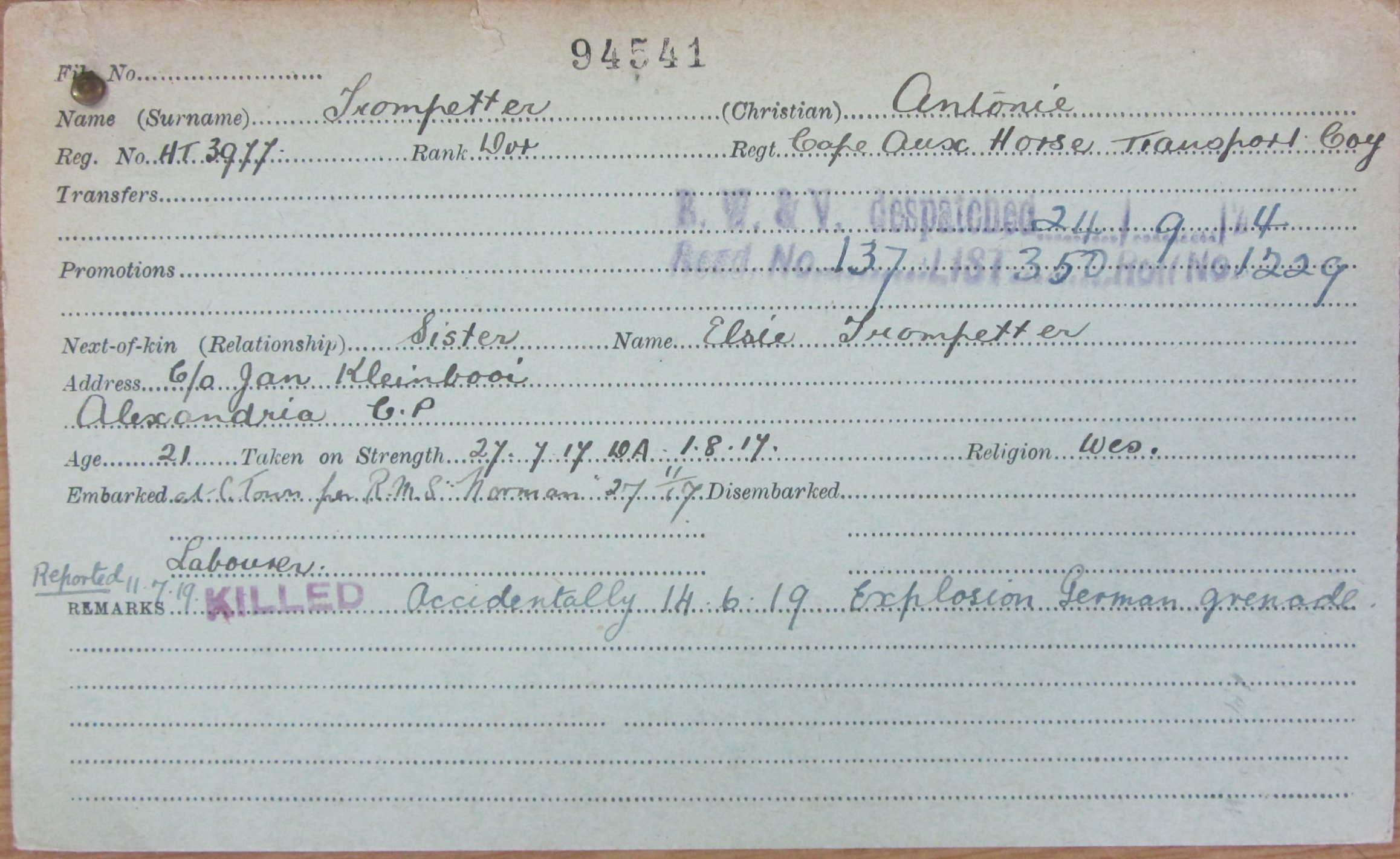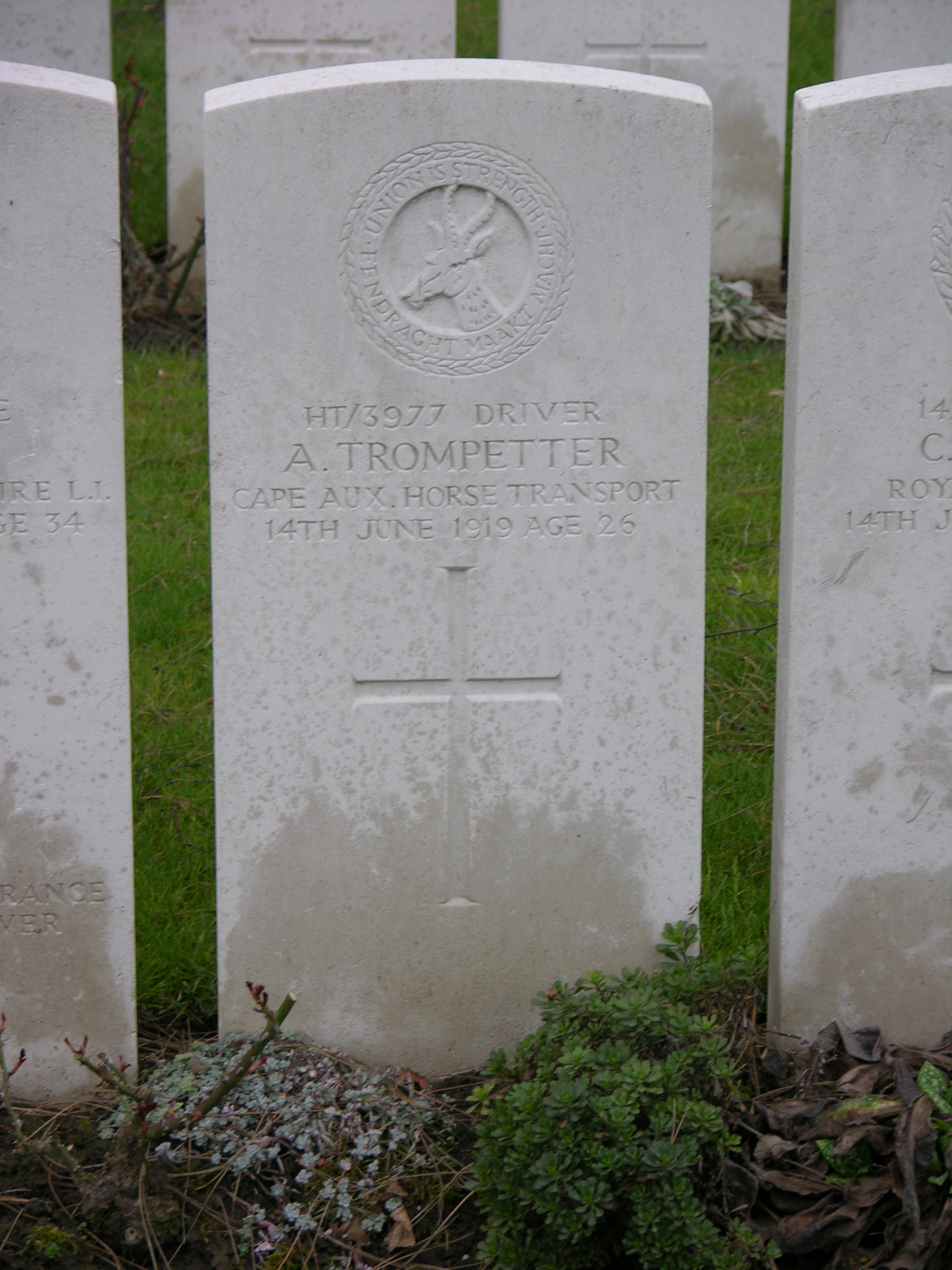 Accidentally killed, by the explosion of a German stick grenade. While with his fellow Driver J Webster around mid day on the 14th of June 1919. He was leading two drought horses from a wagon when one horse stepped on a German grenade, detonating it. Webster laid his friend down next to one of their wagons "10 yards from the railway where it crosses the Neureuil-Fresnes track". Webster raced off to find aid, but Trompetter died alone, very shortly after Webster's departure. |