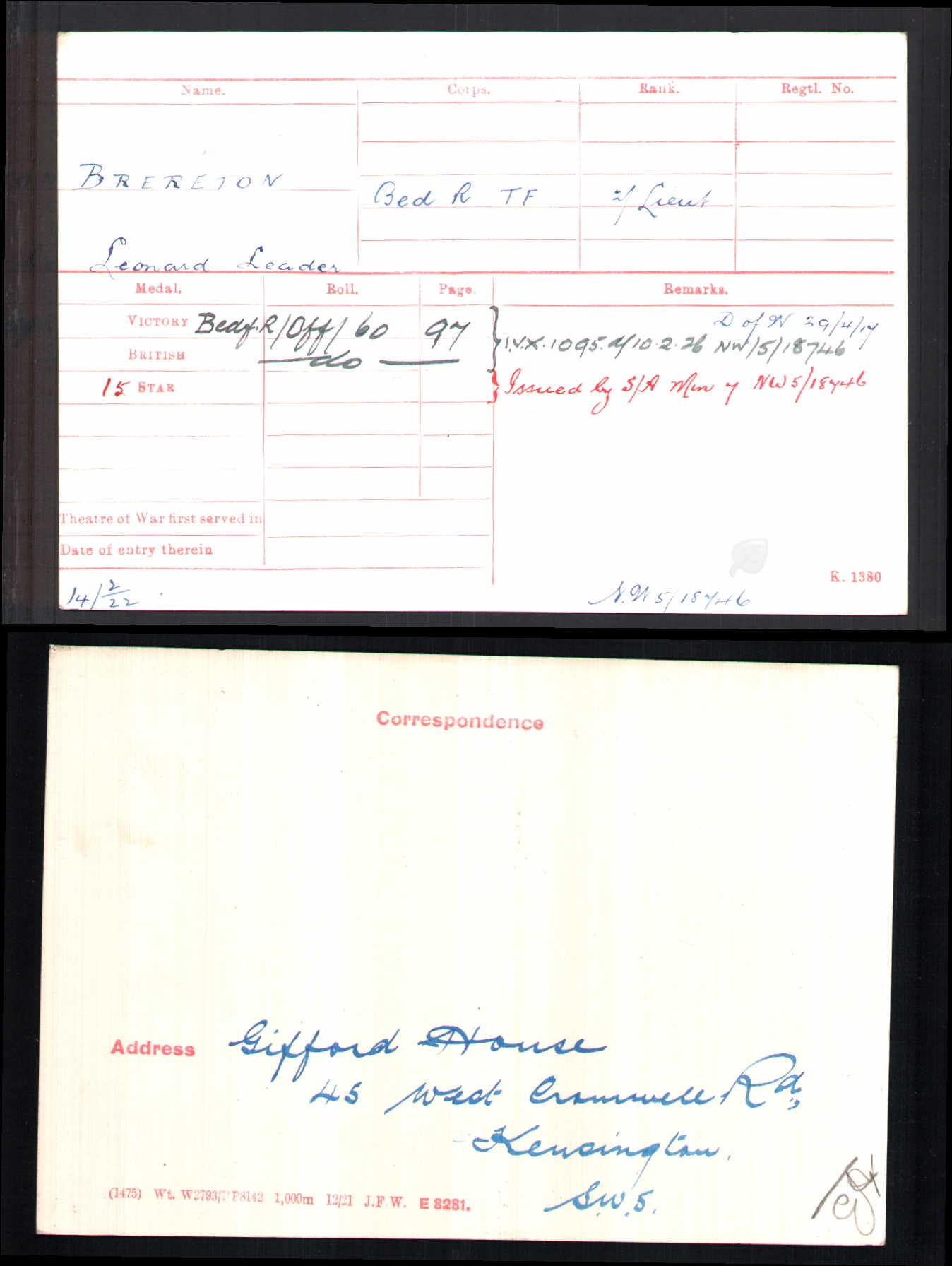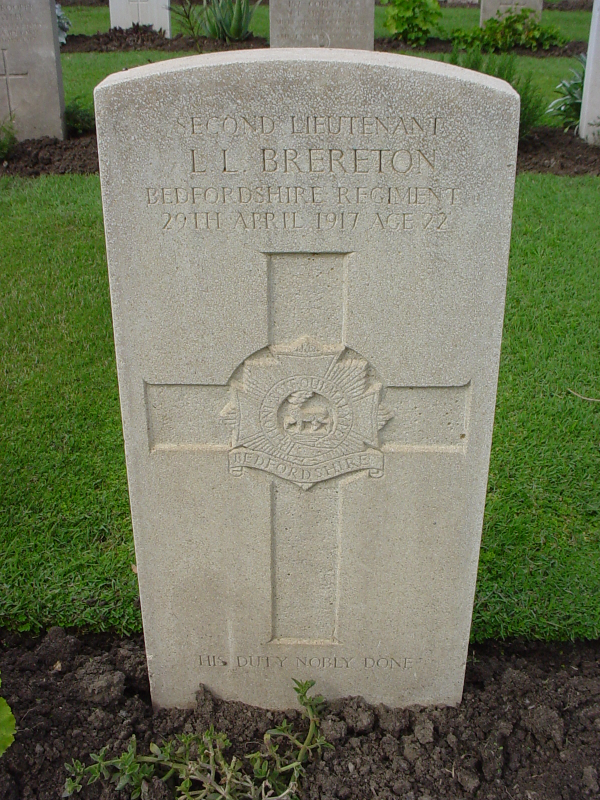 Son of the late L. Brereton, C.E., and of Ruth Brereton, of Natal, South Africa. On Maritzburg College cenotaph. Born 12th February 1895 in Pietermaritzburg, Natal. His father, a Civil Engineer from Cheshire, died relatively young and Leonard and his 3 younger siblings were taken back to the England for their education. His mother was a Hamilton and their family came from Fintra House, Killybegs, Co.Donegal, Ireland. Leonard went to High School at Bedford Grammar and was an outstanding student and athlete. He won the mile trophy two years running as well as winning the sculling fours (see photographs below). It appears that he then went back to Africa to be trained as an engineer, where he worked for the Natal Railways. He next turns up fighting against the Germans in German South West Africa until the campaign ended with their capitulation in 1915. In March 1916 he traveled to England to enroll there. He spent a frustrating few months waiting to take part in the war effort, as can be seen in his diary entries. In November he received orders for Egypt arriving there late January. He died of wounds received at the 2nd Battle at Gaza only 3 months later, aged 22, and is buried in the Cairo Military Cemetery. After his death his colleagues in Natal, South Africa, named a Railway tunnel after him. |